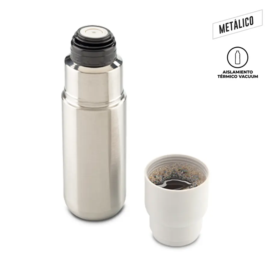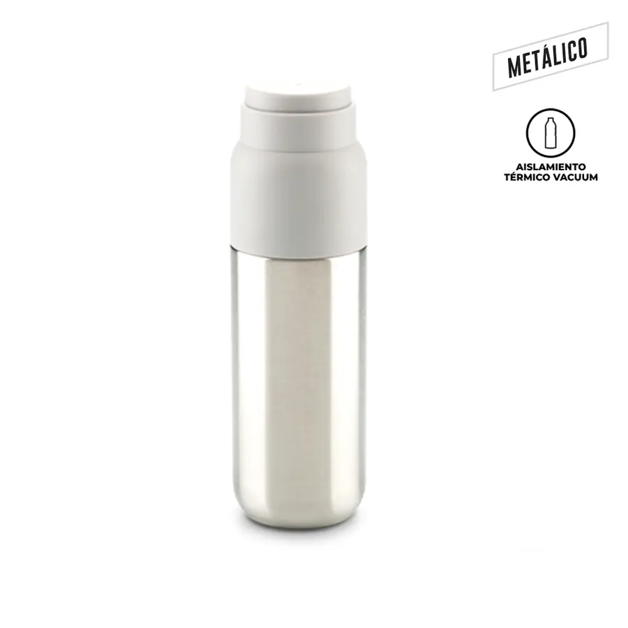 Botilito doble pared vacuum en acero inoxidable, con aislamiento térmico que mantiene la bebida fría o caliente hasta 6h, aprox (puede variar dependiendo condiciones climáticas). Una tapa plástica con función rosca y regulador para servir las bebidas. Una