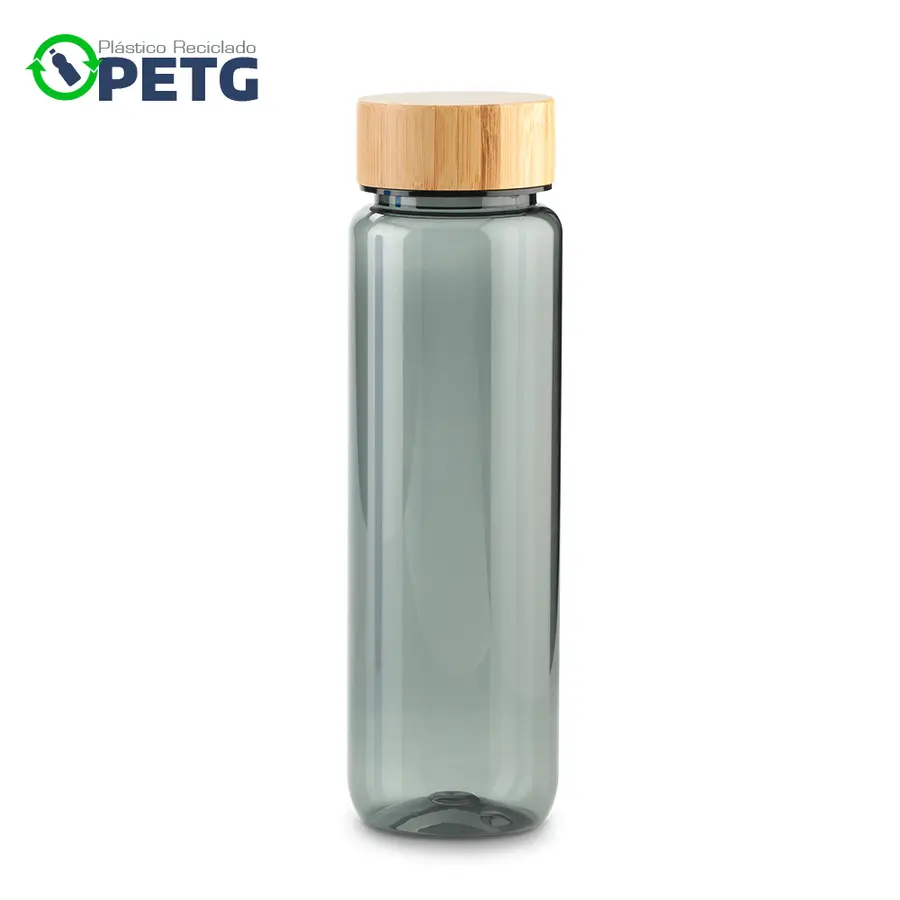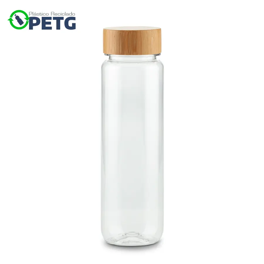Botilito elaborado en plástico reciclado PETG. Material de alta transparencia, mayor firmeza y durabilidad, libre de BPA, resistente al desgaste e impactos menores y reciclable. Tapa rosca en bambú.