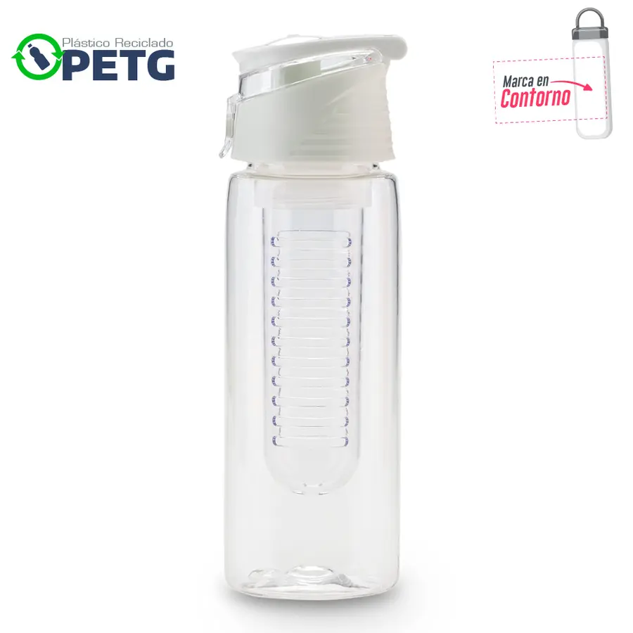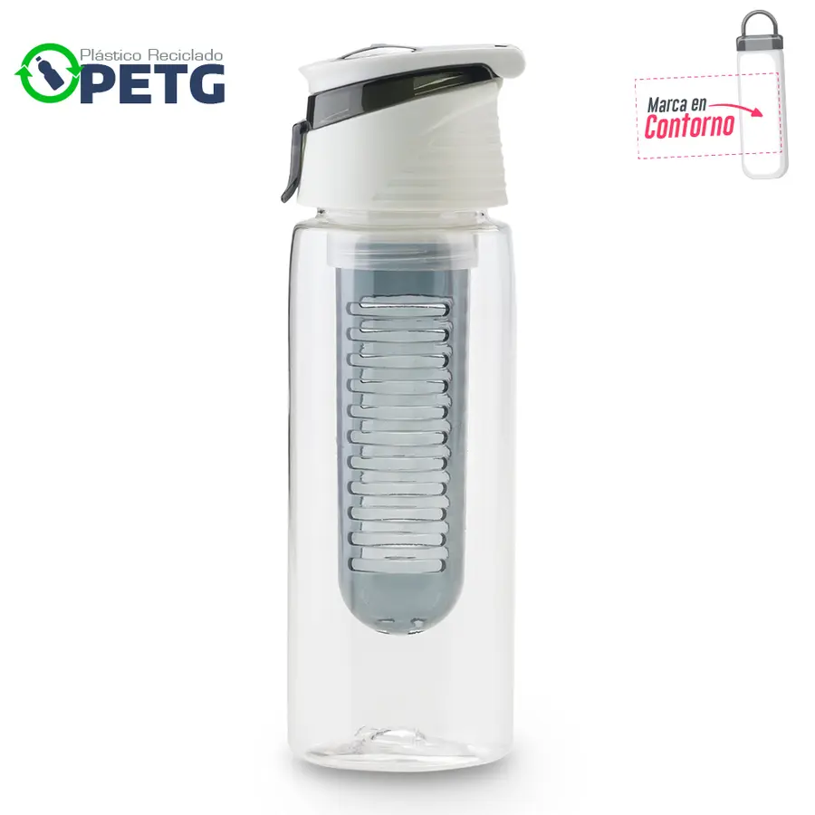 Elaborado en plástico reciclado PETG. Material de alta transparencia, mayor firmeza y durabilidad, libre de BPA, resistente al desgaste e impactos menores y reciclable. Mantiene líquidos tibios hasta 60°C. Con infusor. Tapa pestaña.