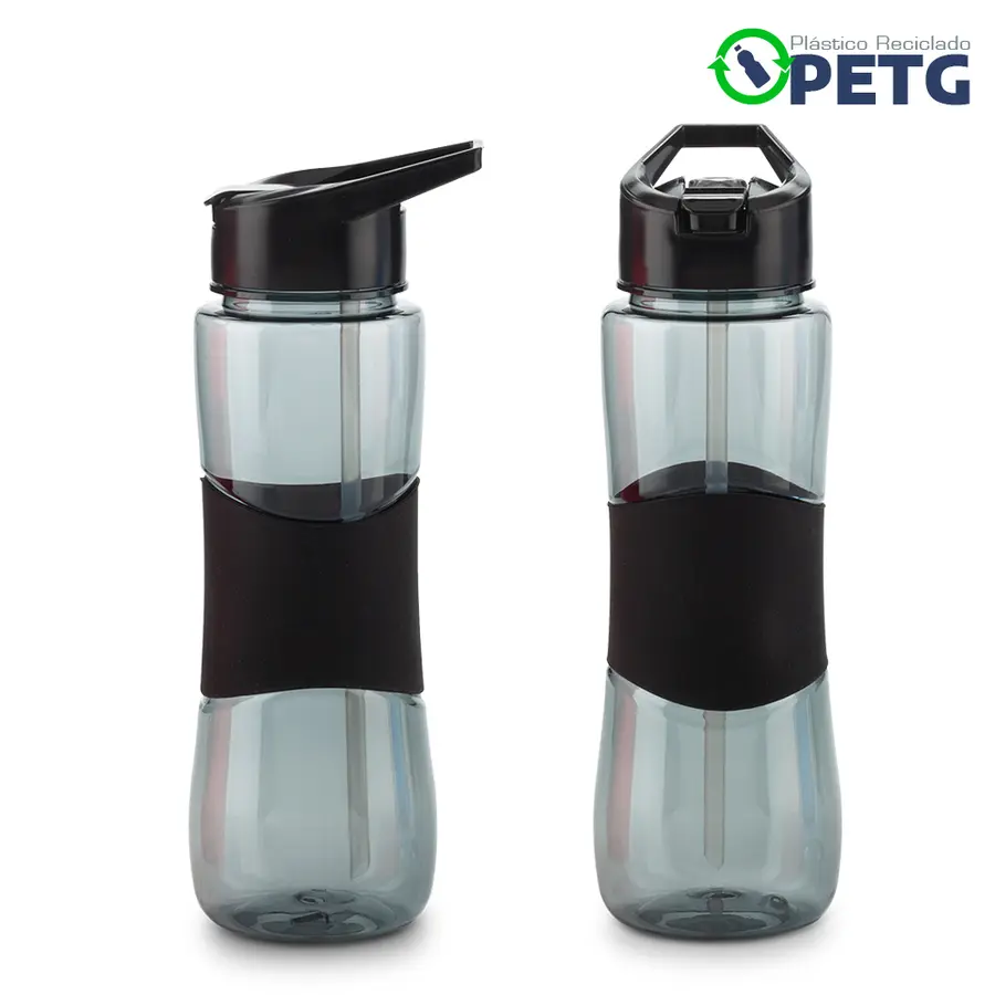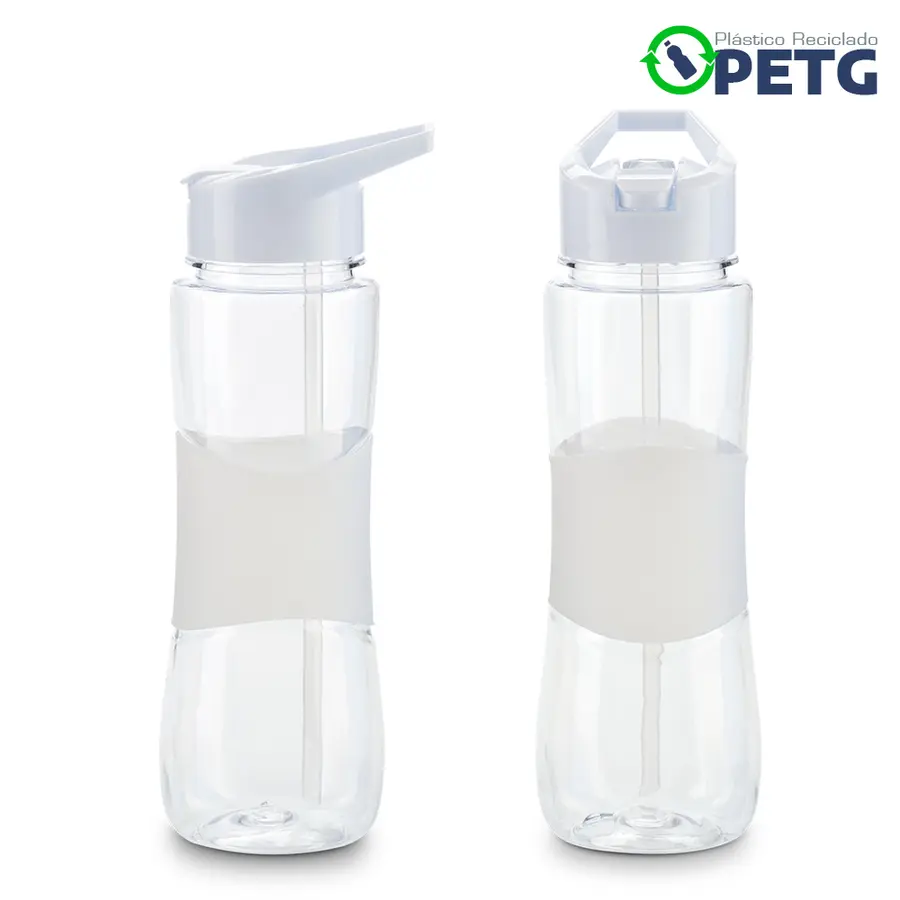 Elaborado en plástico reciclado PETG. Material de alta transparencia, mayor firmeza y durabilidad, libre de BPA, resistente al desgaste e impactos menores y reciclable. Mantiene líquidos tibios hasta 60°C. Tapa de rosca y pitillo.