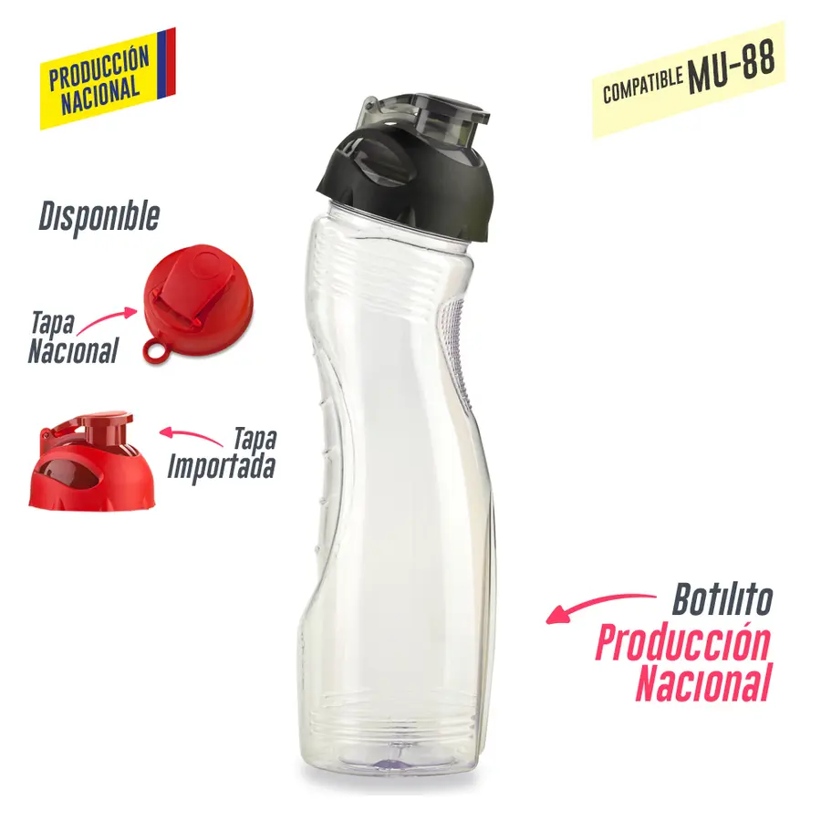 Botilito en PVC atóxico con tapa rosca o tapa pestaña. Compatible con MU-88 Mezclador en Acero Inoxidable.