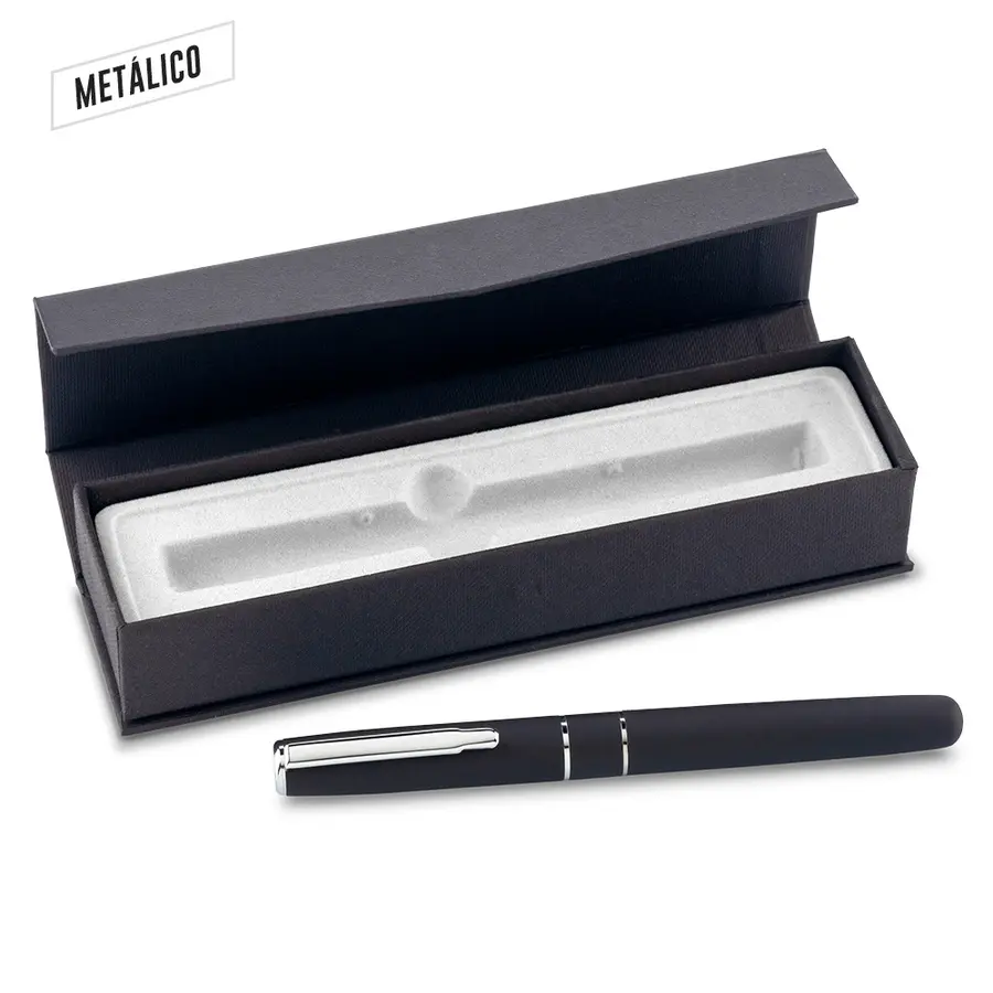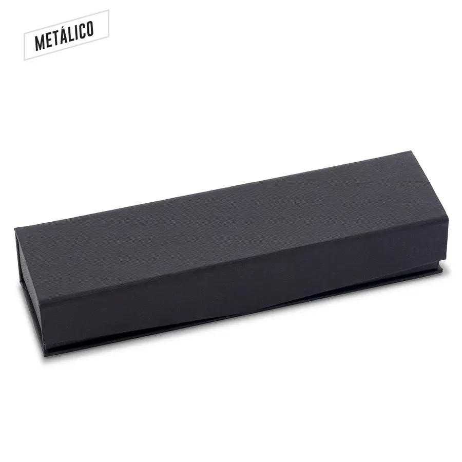Metálico con acabado caucho, clip metálico. Empaque caja individual.