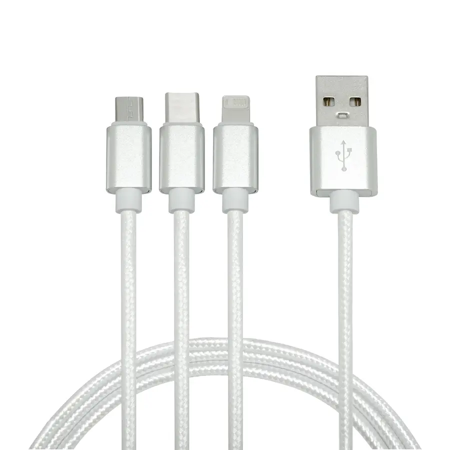 Aluminio y Nylon. 120 cm. Cable con entrada USB y diferentes adaptadores: Iphone, Type C y Android. Viene dentro de una bolsa plásticas con cierre ziploc. Carga rápida de 2,1 a.
