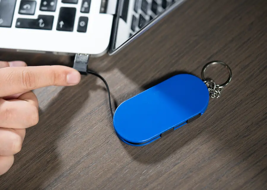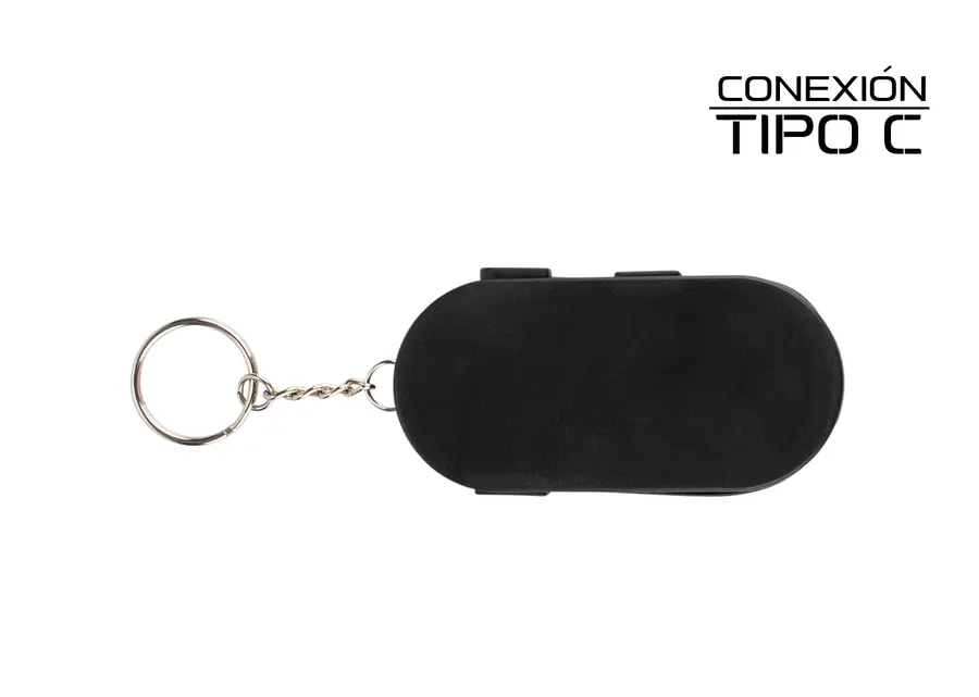 Cable multifunción con forma ovalada que integra conectores USB, Lightning y Tipo C, además de destapador incorporado. Soporta carga de 5V/2A. Diseño compacto con llavero para fácil transporte.