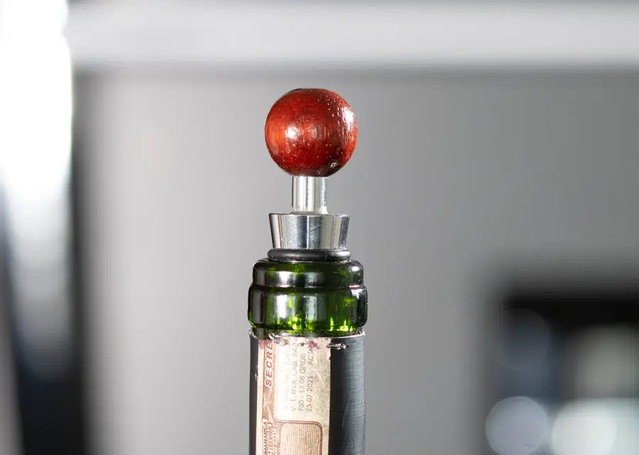 Contiene 4 accesorios con apliques en madera: Tapón para botella, cortagotas, aro antigoteo, sacacorchos de un tiempo. Caja circular de madera con interior beige.