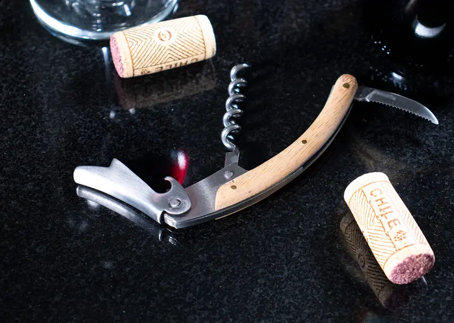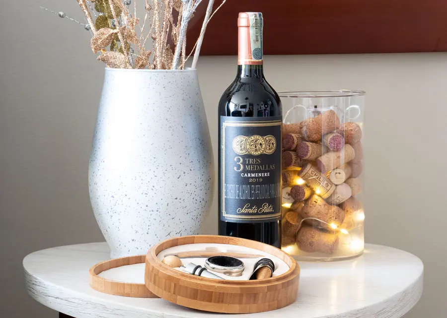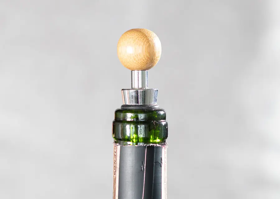 Contiene 4 accesorios de bar con aplique en madera: Tapón para botella, cortagotas, aro antigoteo, sacacorchos de 1 tiempo. Caja interior beige.