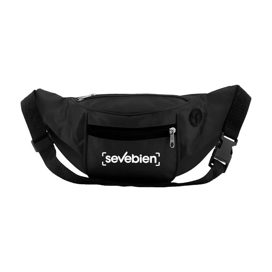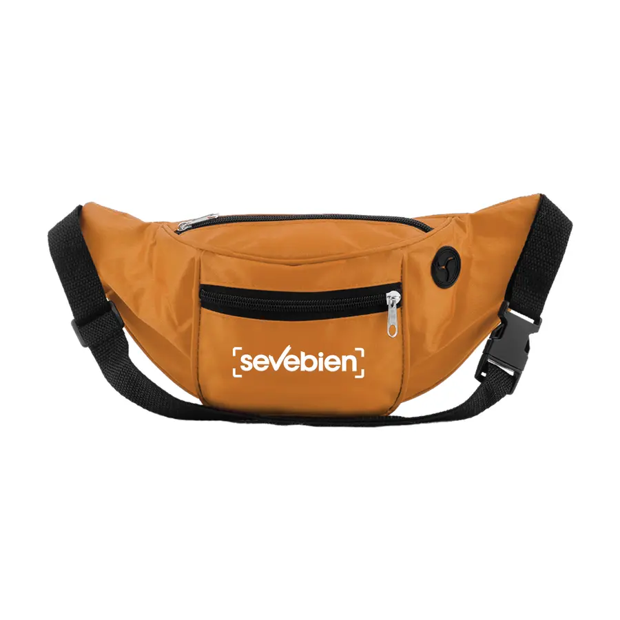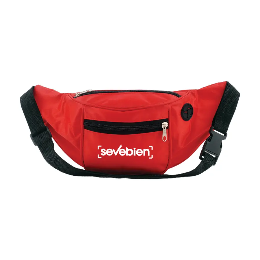 33 x 14,5 cm. Polyester 420D. Cangurera de 2 bolsillos. Salida para audífonos. Correa ajustable con herrajes plásticos. Cierres metálicos.