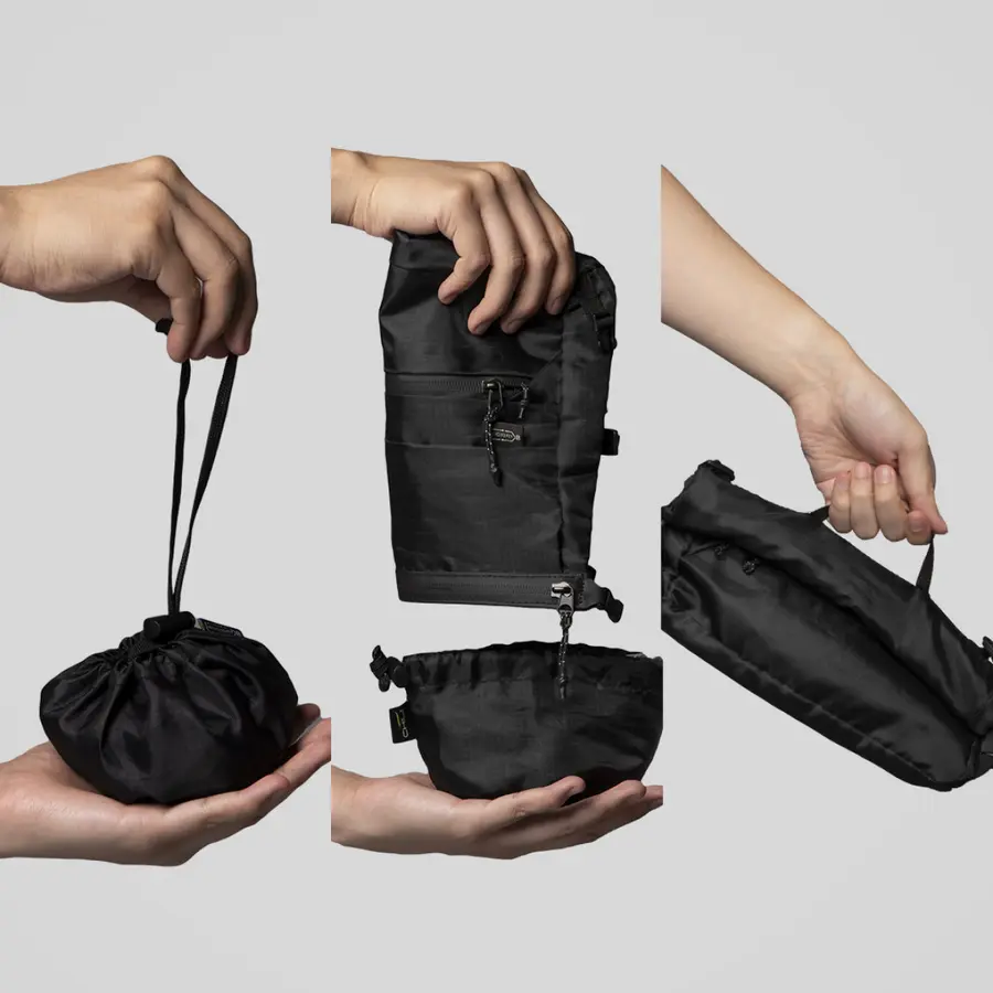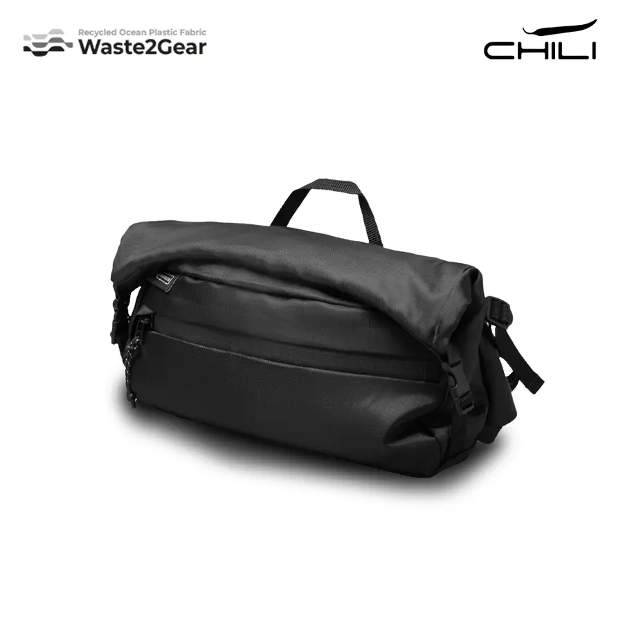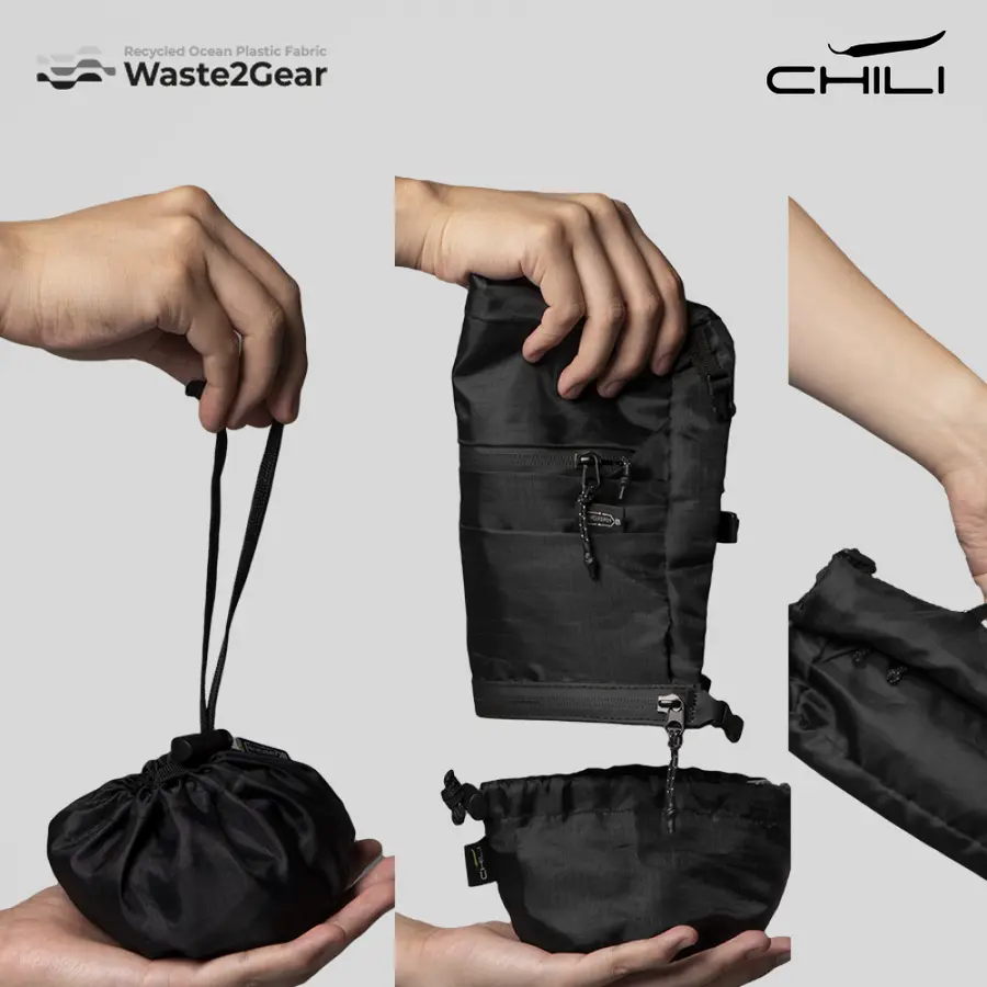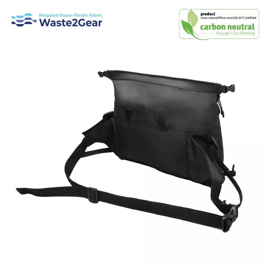 Canguro seco en poliéster reciclado de residuos plásticos recuperados del océano. Un bolsillo externo con cremallera. Incluye bolsa para guardarlo.
