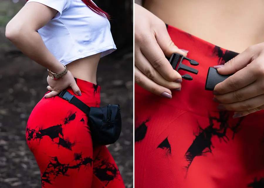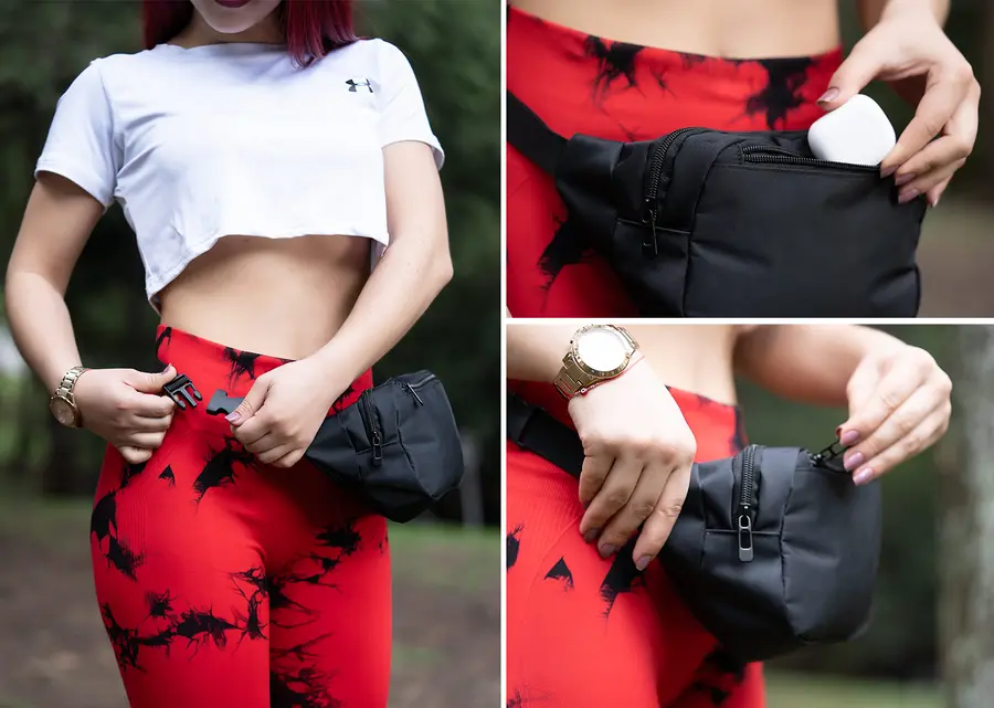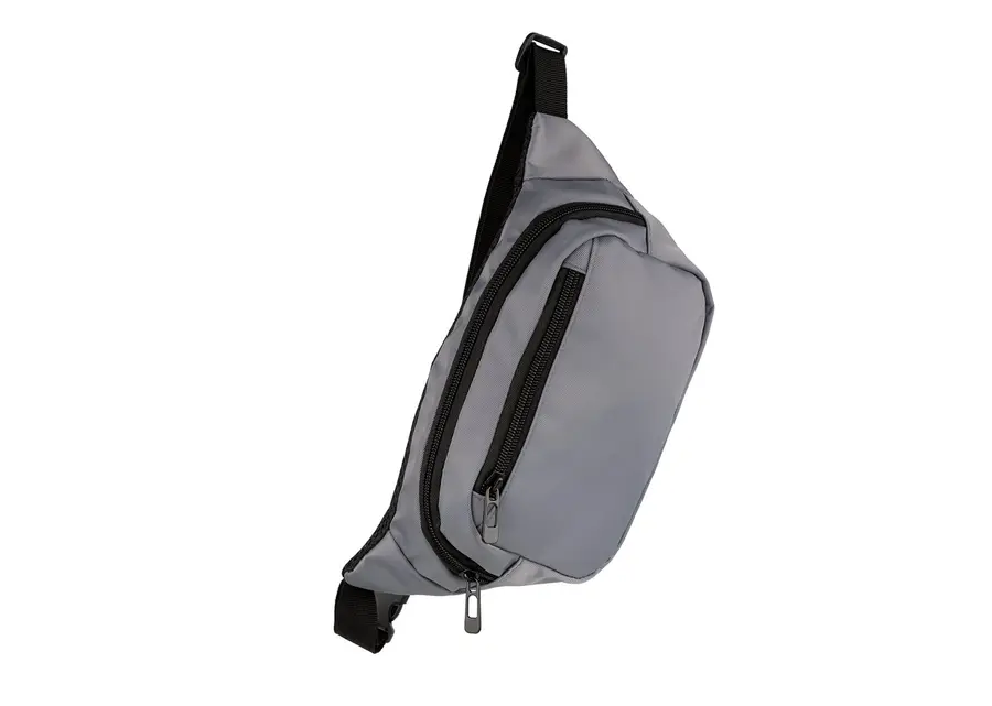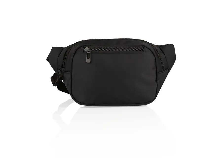Canguro con bolsillo frontal y trasero con cremallera. Cuenta con una correa ajustable a la cintura con broche de hebilla plástico.