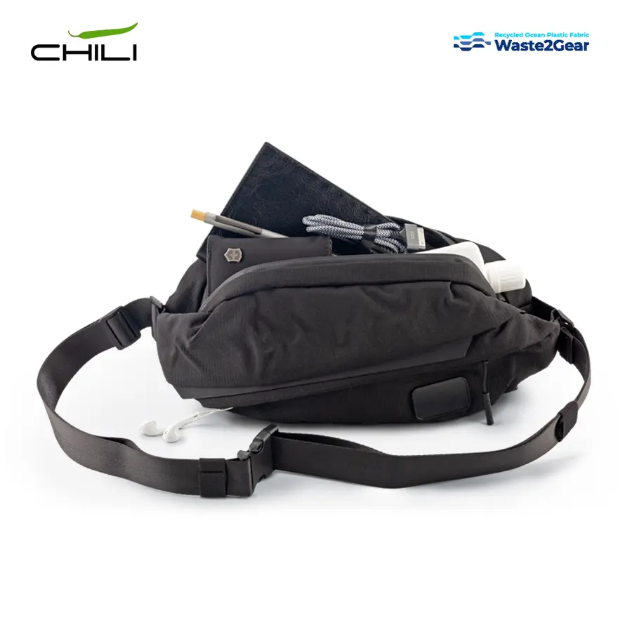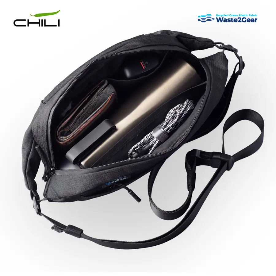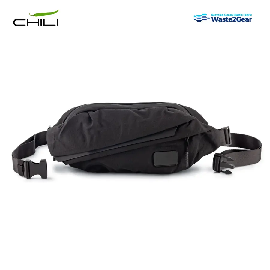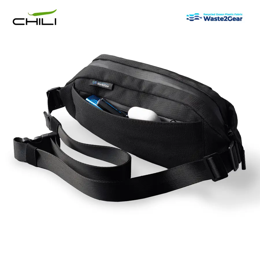 Canguro en poliéster reciclado de residuos plásticos recuperados del océano. Tres compartimentos con cierre de cremallera. Incluye placa metálica para marcar.