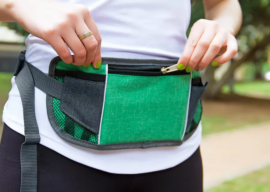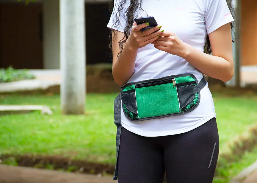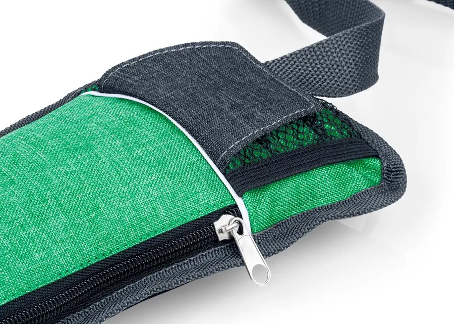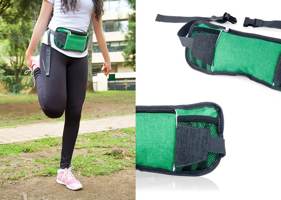 Canguro con correa ajustable de 105 cm y cierre tipo click, con bolsillos frontales en malla de fácil acceso ideales para llevar cables, audífonos etc.