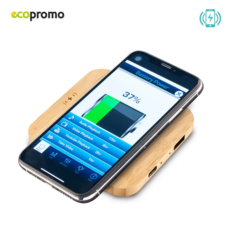 Cargador inalámbrico en bambú de 5W, entrada USB Tipo A y entrada Tipo C. Input: 5V/3A, Output:5V/1A.