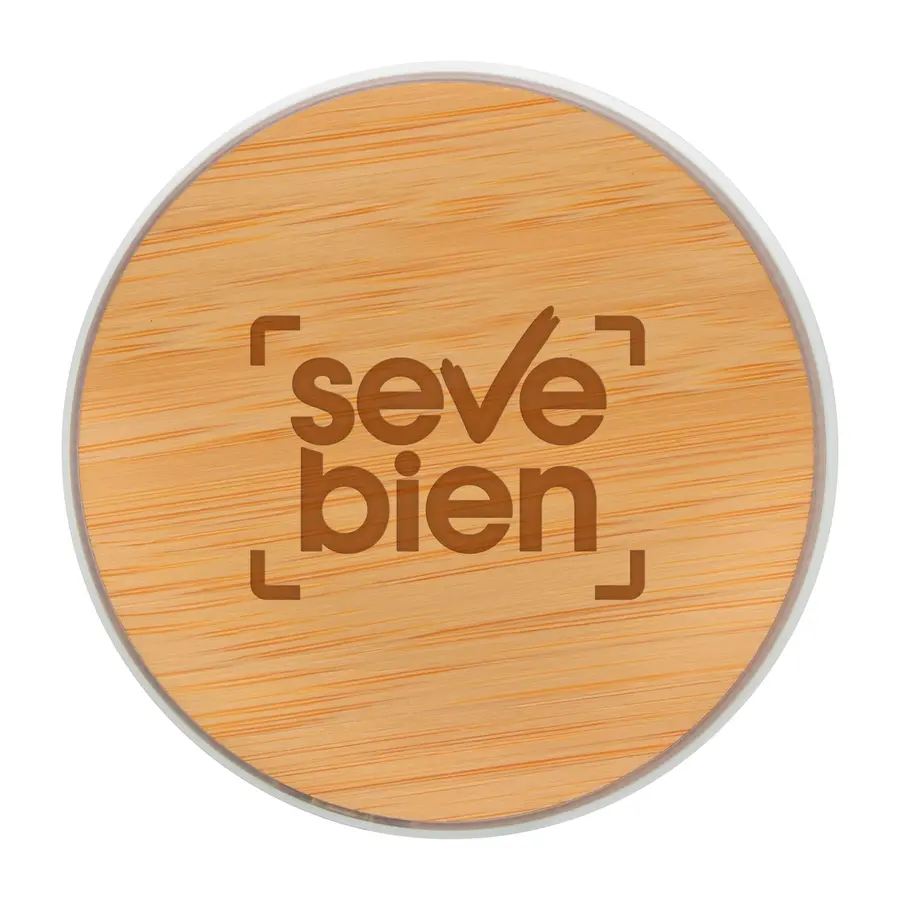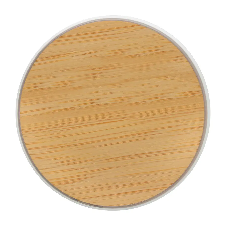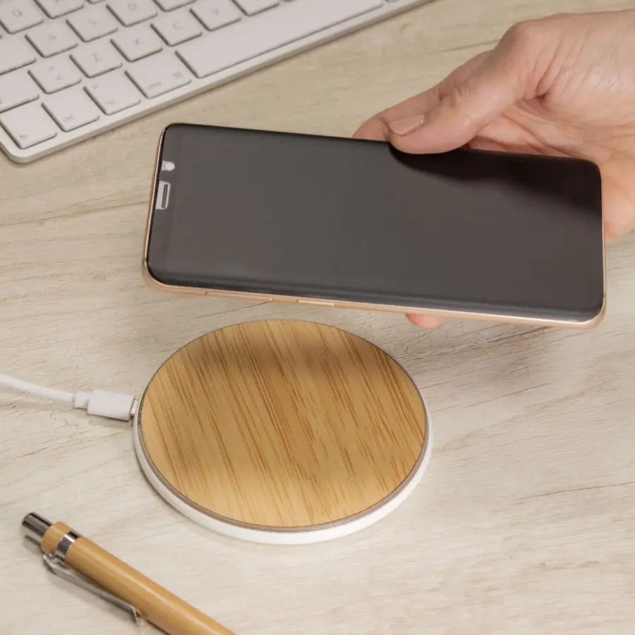 Ø 10 x 0,9 cm. Bambú + Plástico ABS. Cargador inalámbrico. Base plástica color blanco con antideslizantes. Entrada: 5V/2A, 9V/1.1A. Salida: 10 watts. Distancia de transmisión: <=8 mm. Eficiencia de Carga: >=73%. Control de temperatura. Detección de objetos extraños. Luces indicadoras de carga. Cable de carga USB-C en color blanco de 50 cm de largo. Presentación en caja de regalo kraft.