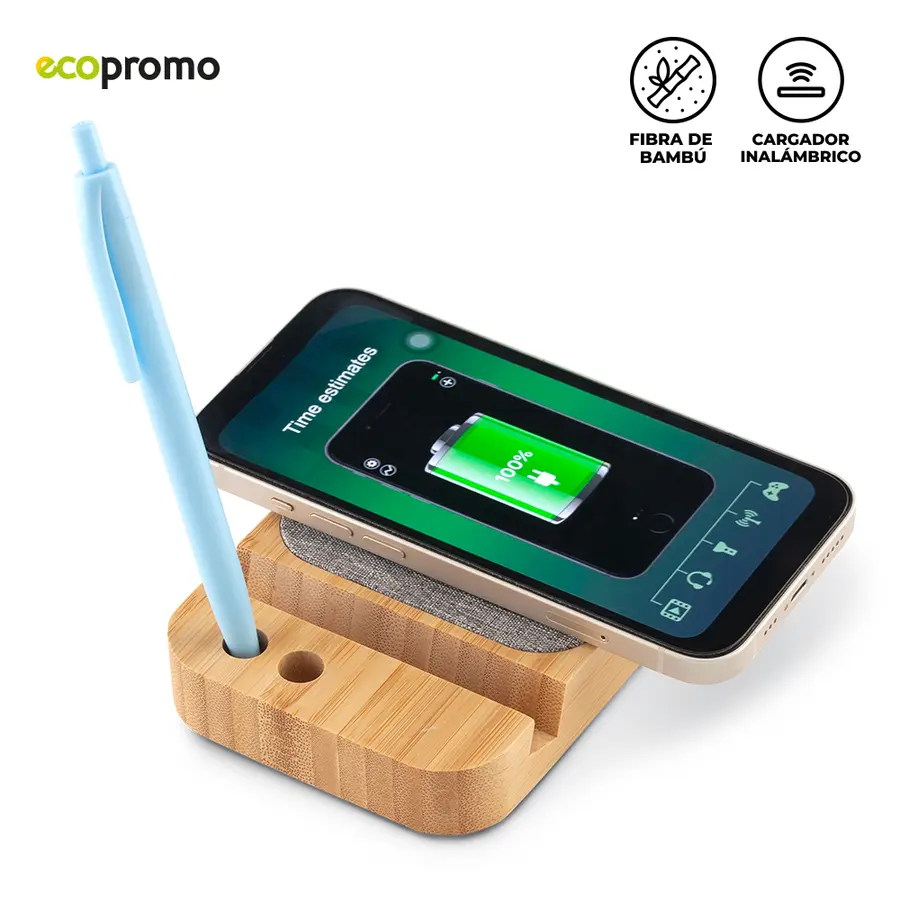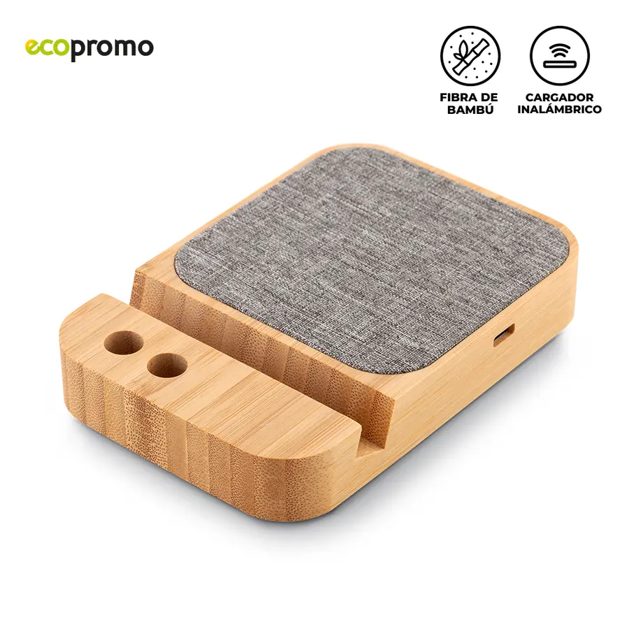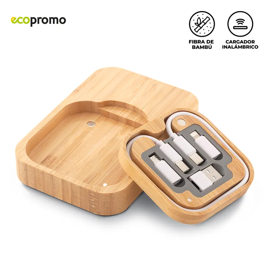 Cargador inalámbrico en bambú y tela. Incluye cable multicargador y tapa con imán.