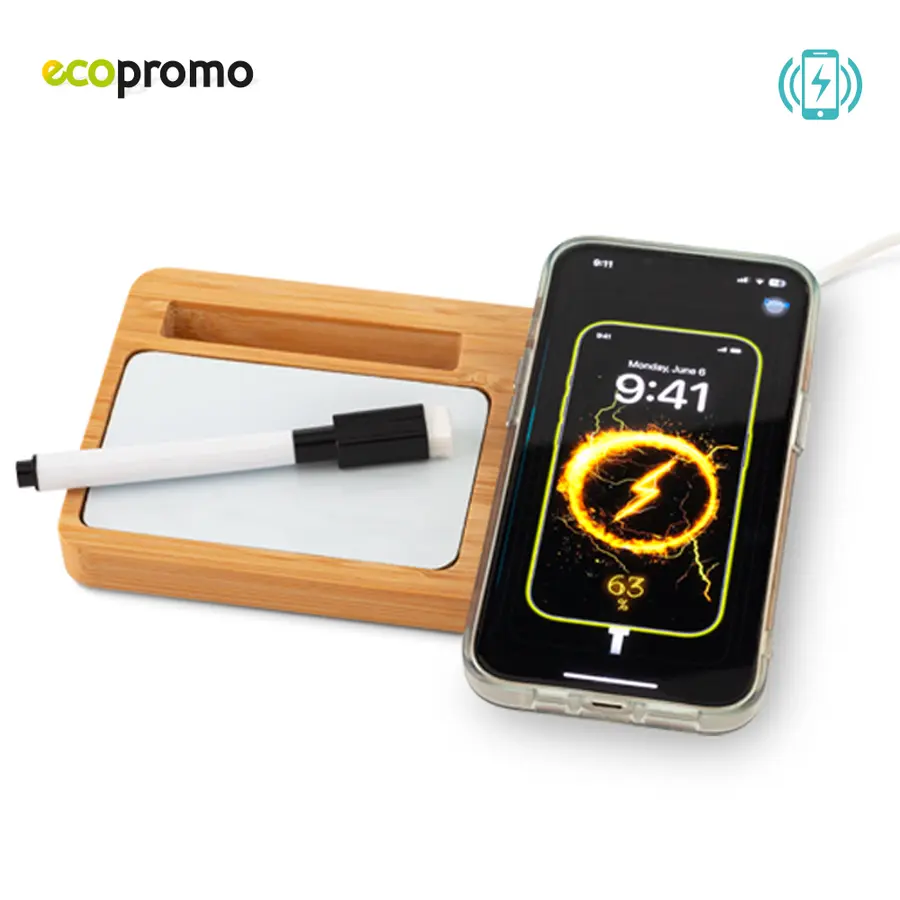 Cargador inalámbrico en bambú de 5W con soporte para celular y mini tablero con marcador borrable. Incluye cable con doble conexión para carga, Tipo C y Tipo USB. Empaque caja individual.