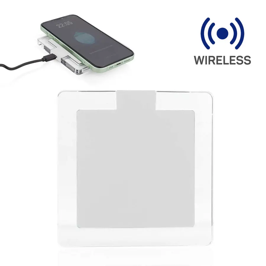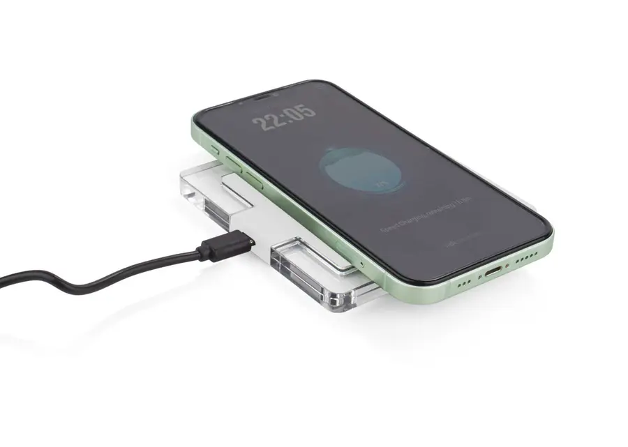 Cargador inalámbrico de 15 W con elegante diseño de bordes transparentes y superficie en contraste. Cuenta con entrada Tipo C para una carga estable y eficiente, compatible con dispositivos que soporten carga inalámbrica Qi. Ideal para mantener tu espacio de trabajo moderno y ordenado.