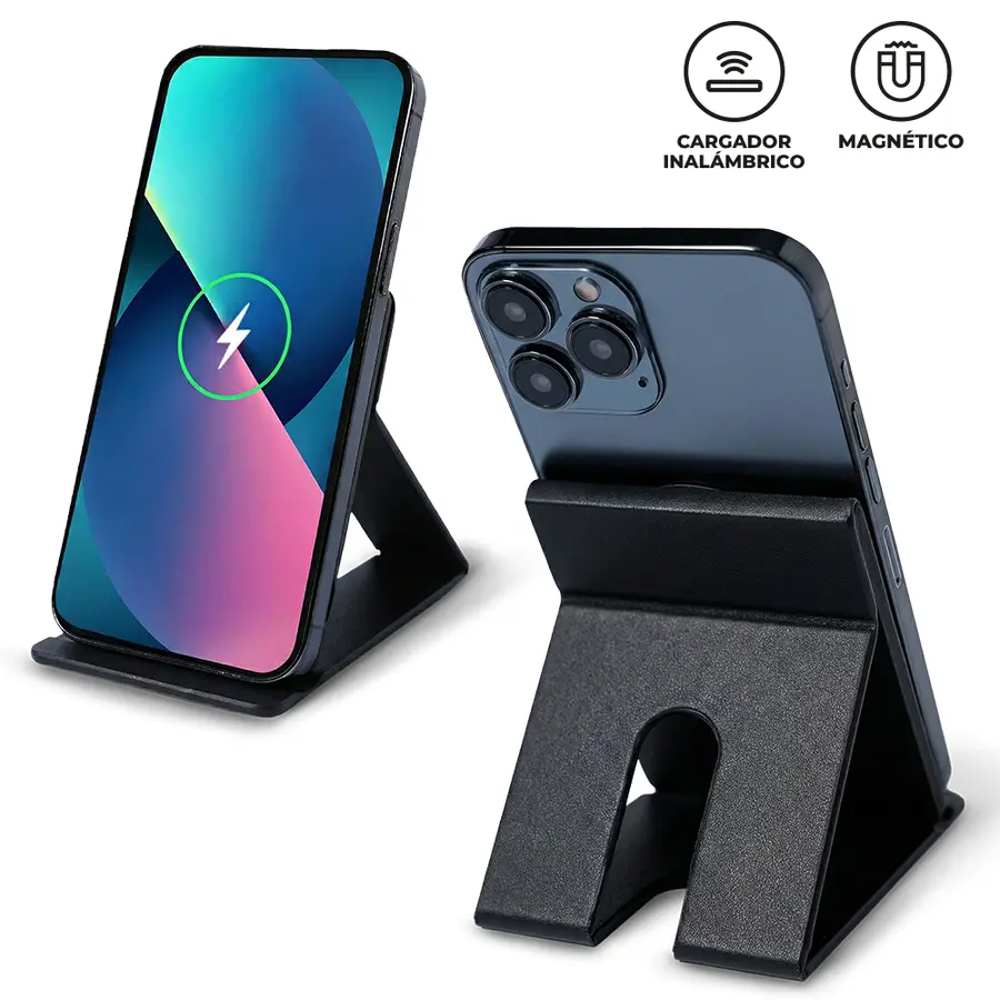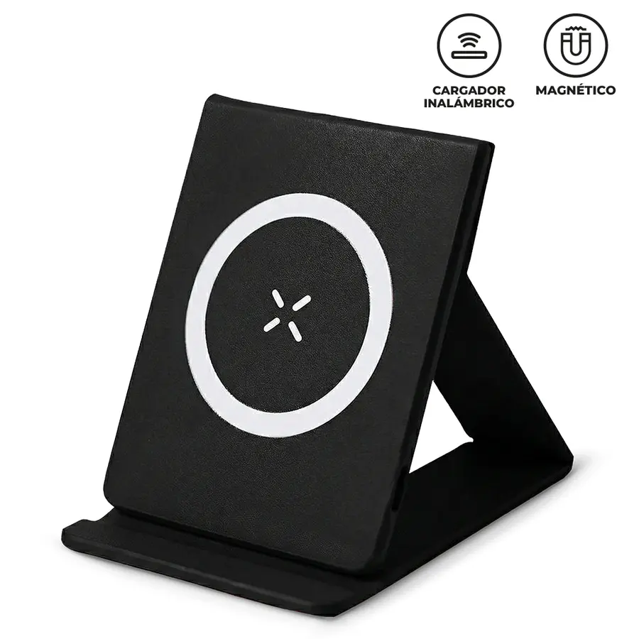 Cargador inalámbrico plegable en poliuretano de 15W. Incluye cable Tipo C para carga y anillo metálico adhesivo. Empaque Caja Individual.