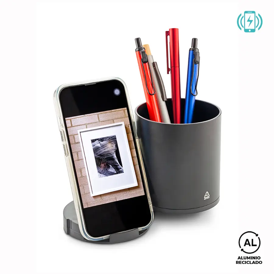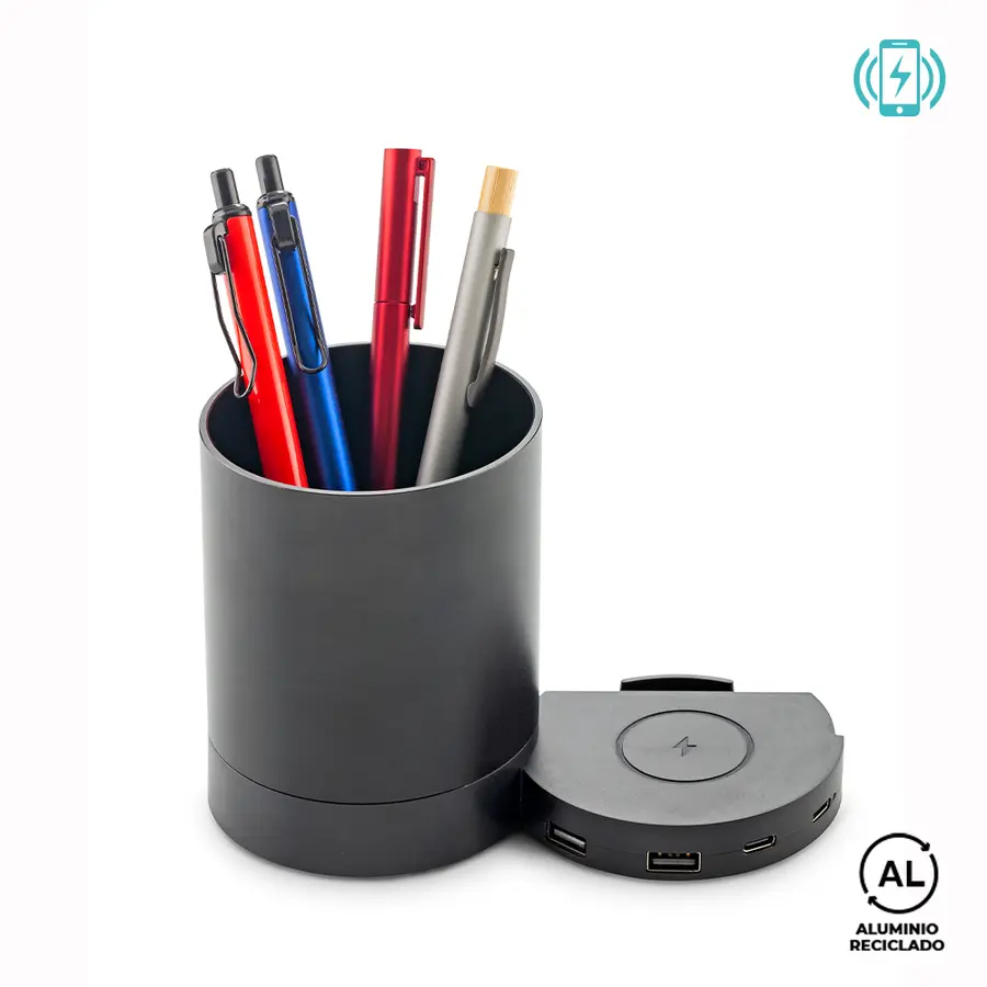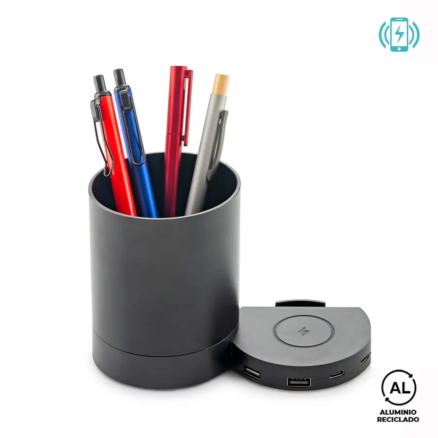 Cargador inalámbrico en aluminio reciclado de 5W con portabolígrafos. Dos puertos USB y dos Tipo C. Incluye cable Tipo C para carga. Empaque caja individual.