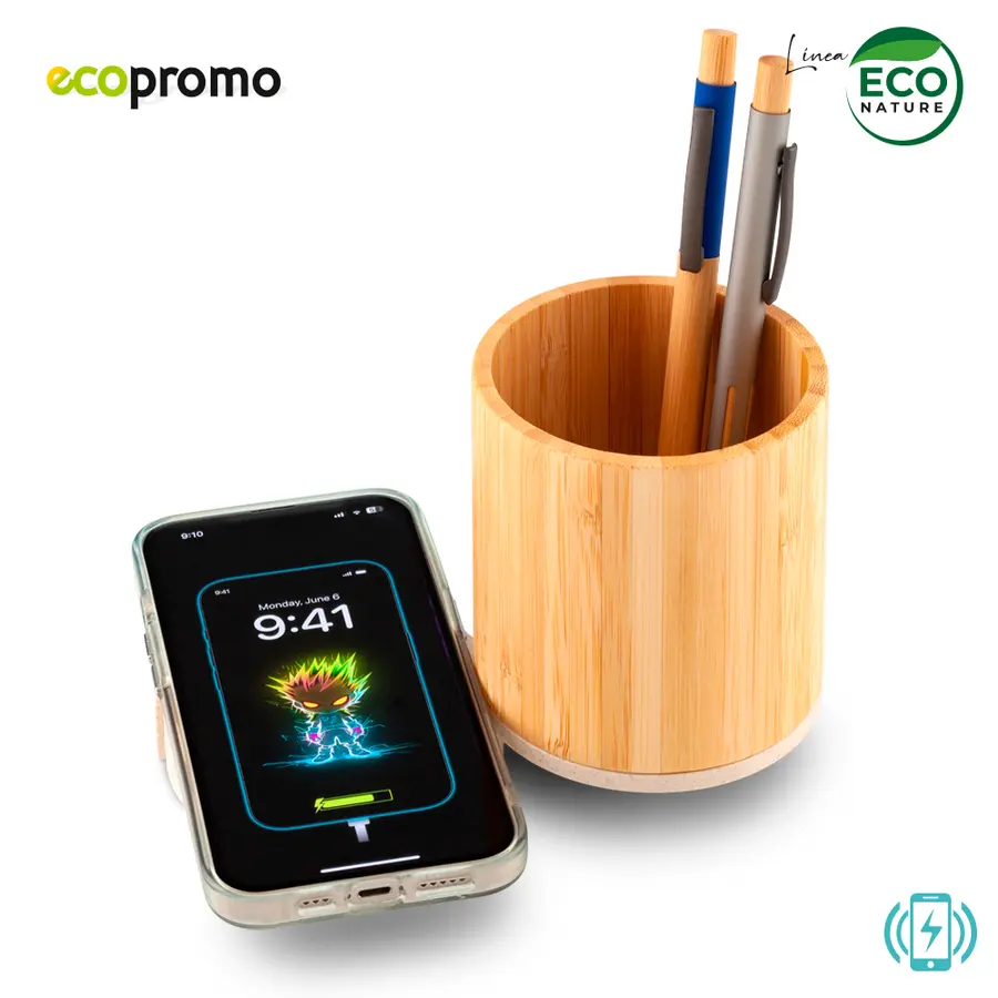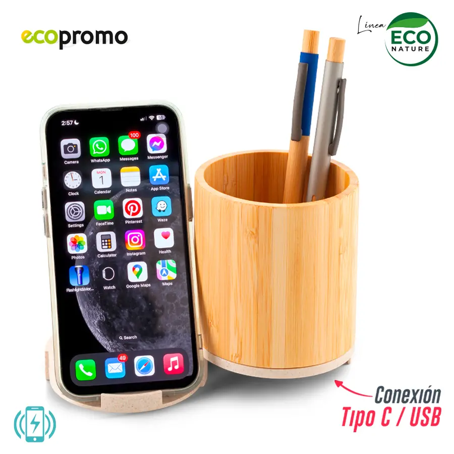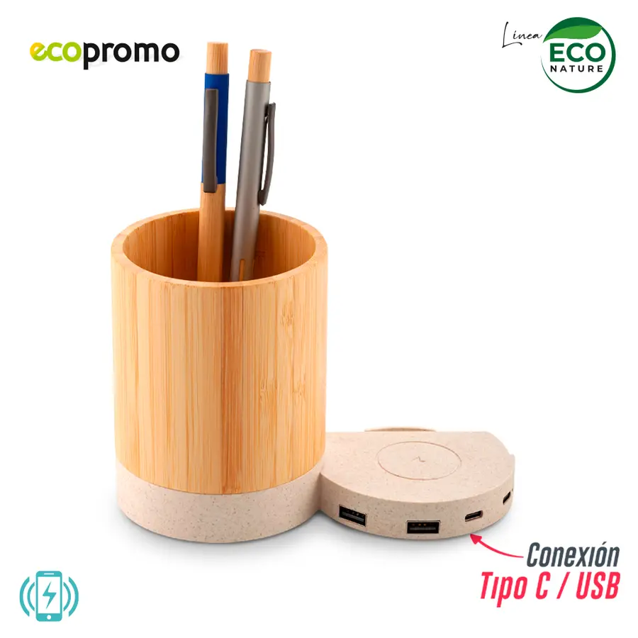 Cargador inalámbrico en fibra de trigo de 5W con portabolígrafos en bambú. Dos puertos USB y dos Tipo C. Incluye cable Tipo C para carga. Empaque caja individual.Lo que de saber: Este artículo transmite la energía y NO acumula carga para llevar, funciona siempre y cuando esté conectado. Sirve únicamente en dispositivos móviles que vengan desde fábrica con la funcionalidad de carga inalámbrica.Nota ImportanteLa tecnología de carga inalámbrica funciona con los dispositivos móviles compatibles con esta funcionalidad; se recomienda buscar en las especificaciones de su dispositivo móvil y en el manual de uso que puede descargarse para cada marca y modelo, si su dispositivo es compatible. Se recomienda retirar el forro protector de su móvil y cualquier otro elemento que genere interferencia cuando se coloque a cargar.
