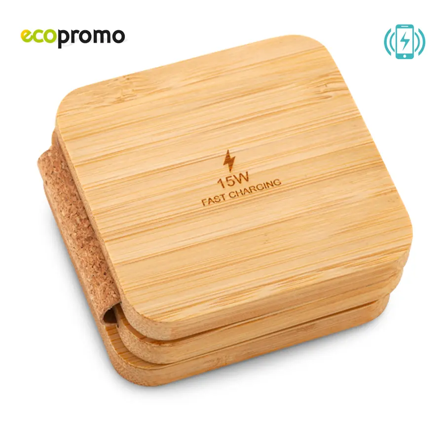 Cargador inalámbrico 3-1 plegable en bambú y corcho de 15W. Cargador para Celular, Apple Watch y Audífonos. Incluye cable Tipo C para carga. Empaque caja individual.