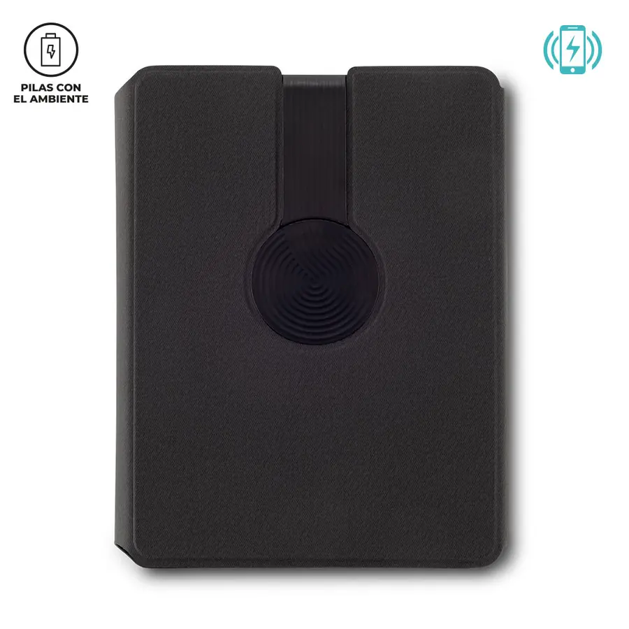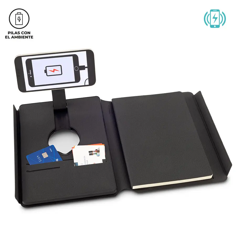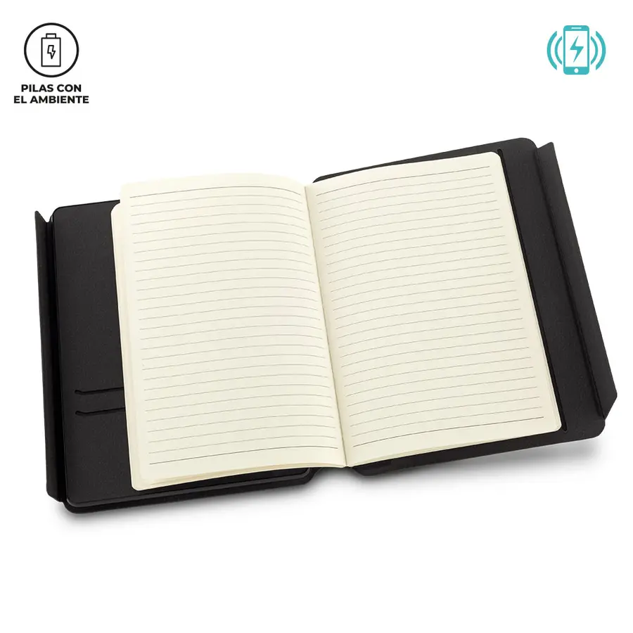 Cargador inalámbrico de 10W para móviles y 5W para auriculares, Con pila recargable de 5000mAh. Compatible con dispositivos equipados con tecnología de carga inalámbrica, Cubiertas y libreta en poliuretano de 80 hojas. Con cierre imantado. Empaque Caja Individual.