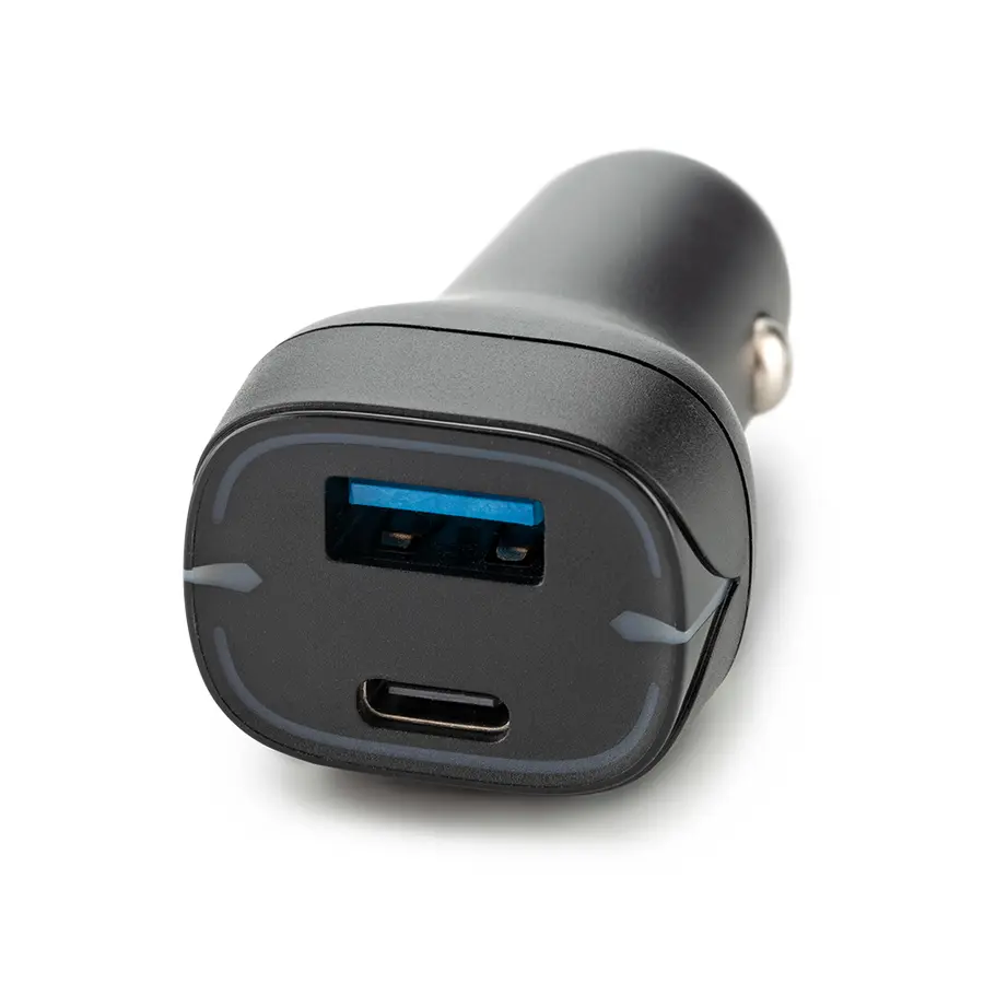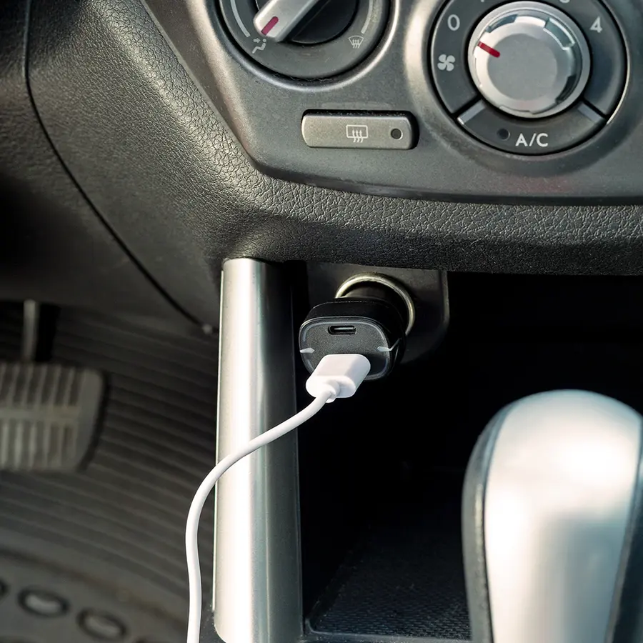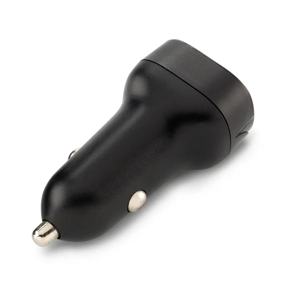 Cargador plástico dual para carro, con puertos USB y Tipo C. Empaque caja individual.