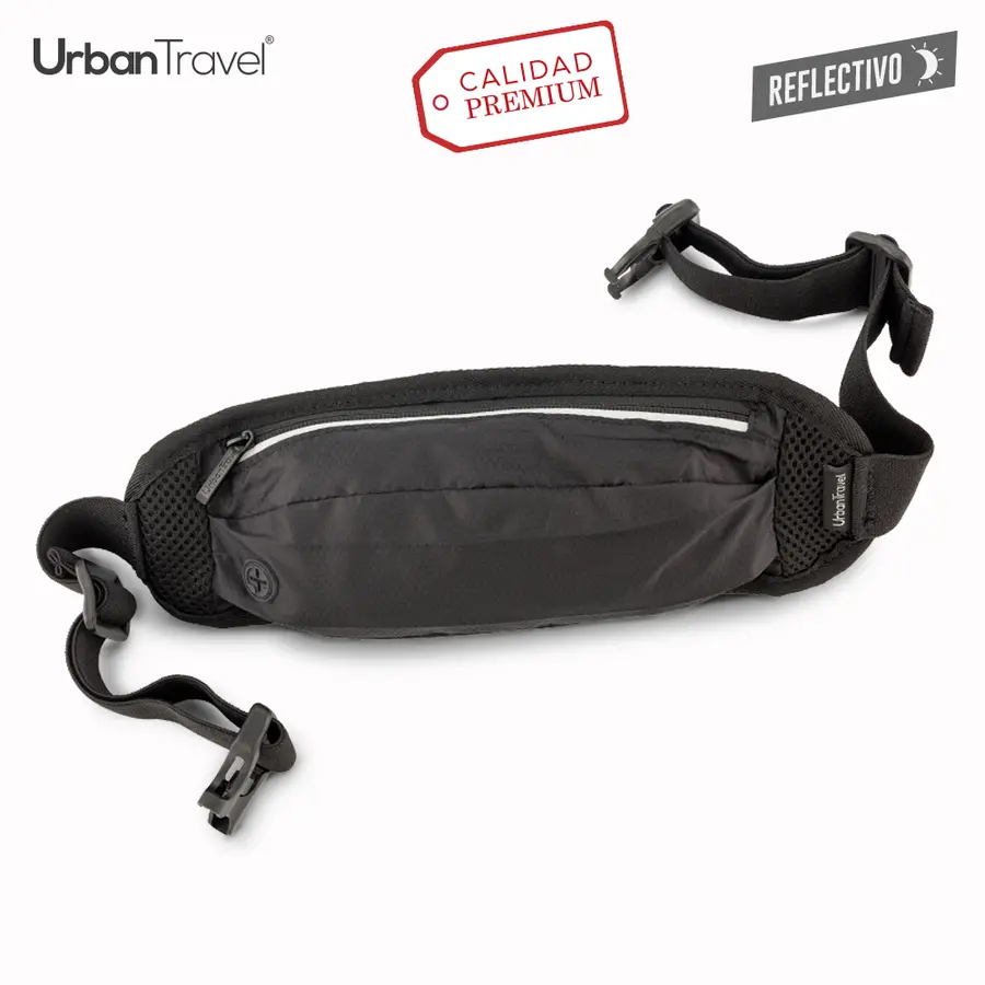 Canguro en poliéster impermeable. Dos bolsillos con cremallera (uno externo y el otro interno), y salida para audífonos.