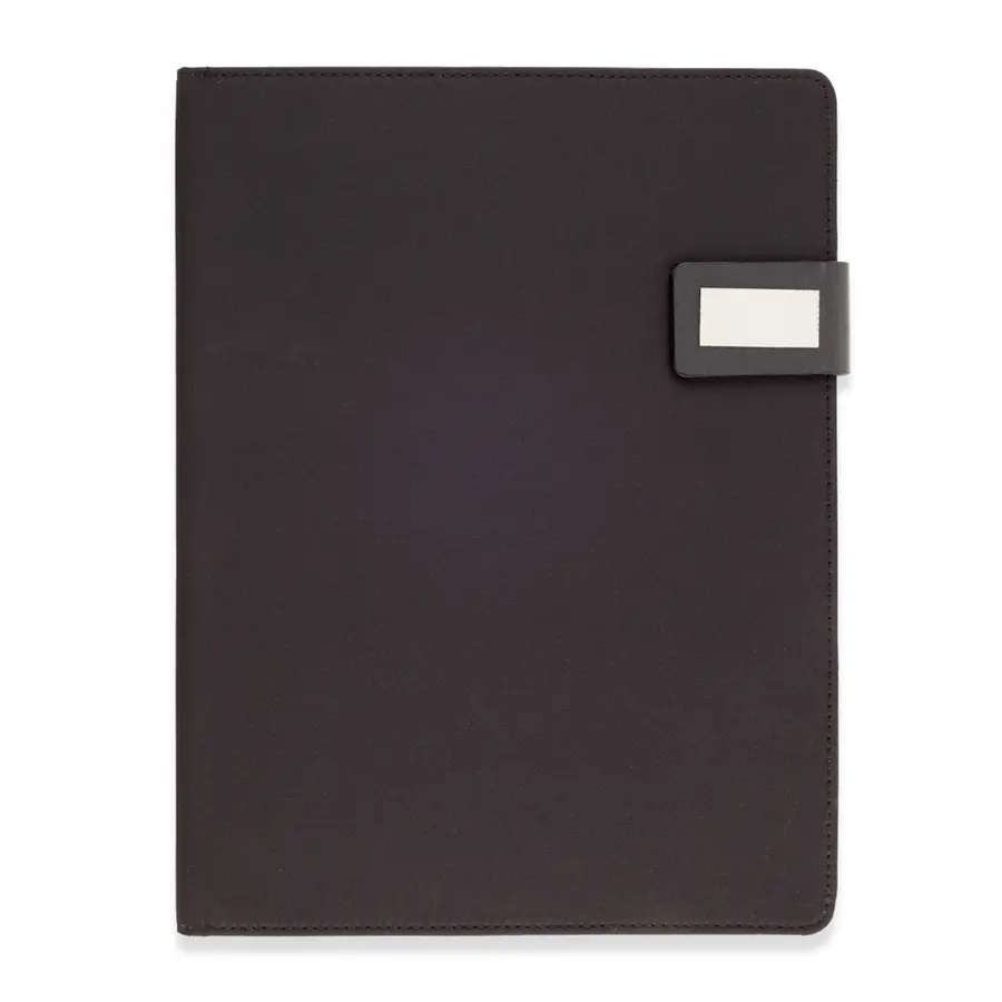 Folder en microfibra con cierre de imán. Incluye block de papel, 4 portatarjetas, funda portacelular y 2 elásticos multiorganizadores. No incluye bolígrafo.