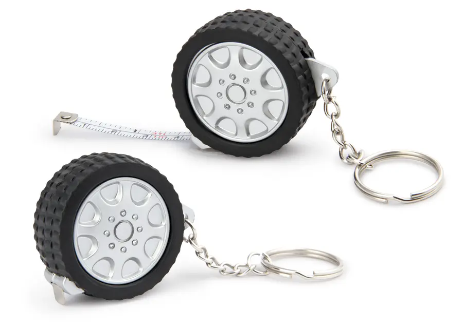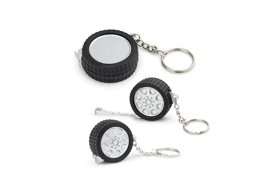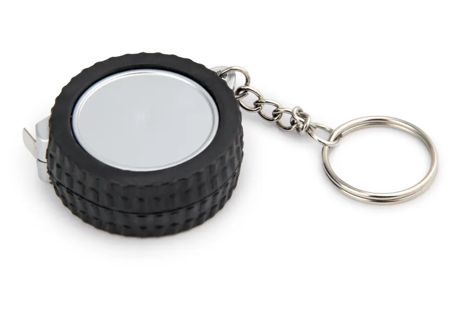 Llavero con cubierta en forma de llanta. Con cinta métrica metálica de 1m/39 pulgadas. Con argolla para llavero.