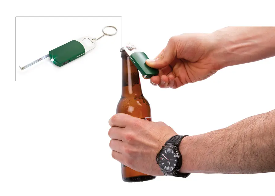 Llavero destapador con cinta métrica metálica de 1 metro/39 pulgadas. Destapador y linterna de un LED.