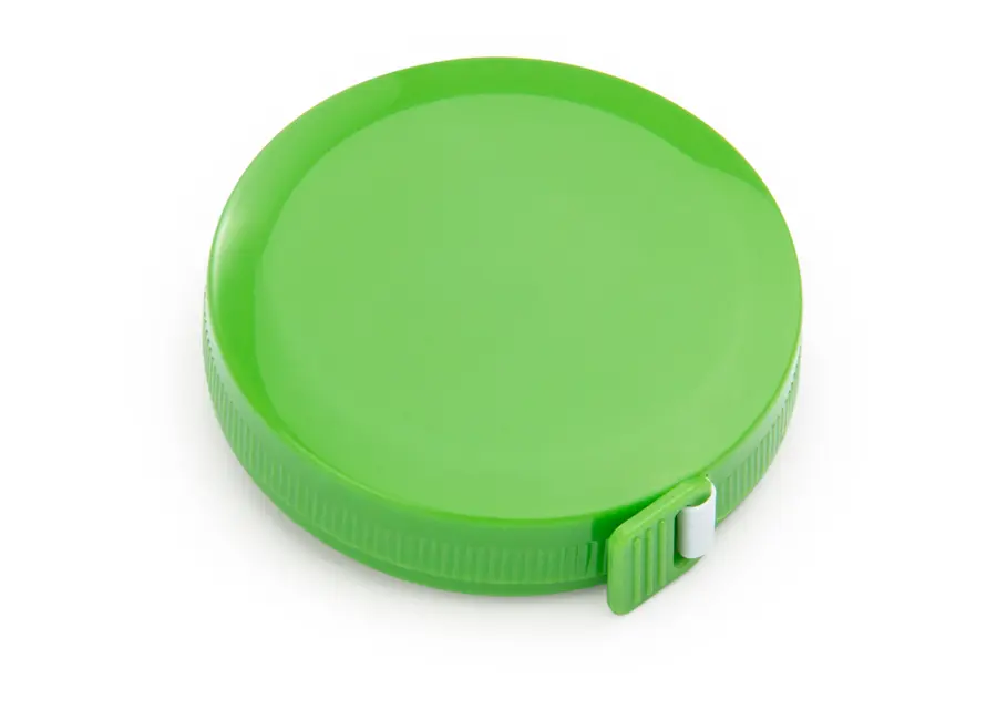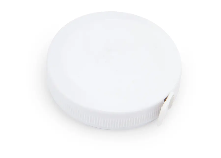 Metro con cubierta circular, con seguro de botón al centro. Cinta métrica plástica de 1,5 m. – 60 Pulg. Escala métrica y pulgadas.