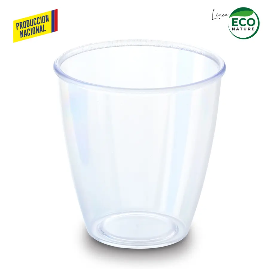 Copa plástica en poliestireno cristal translúcido o color sólido en polipropileno. Opcional en material fibra de trigo.
