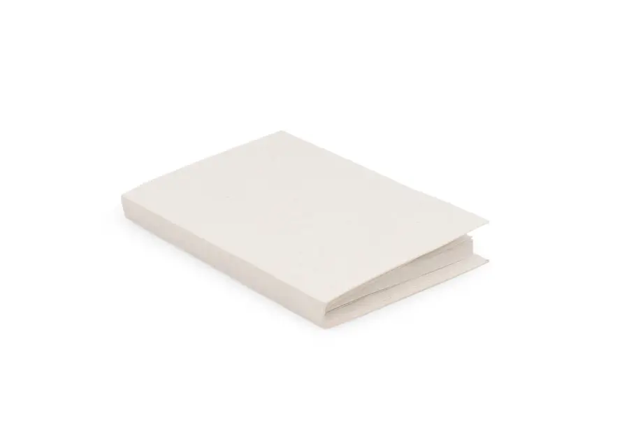 Tapas de cartón ecológico gruesas, 80 hojas. Cartuchera en cambrel con cremallera. Bolígrafo de cartón. De 14.5 x 18 cm.
