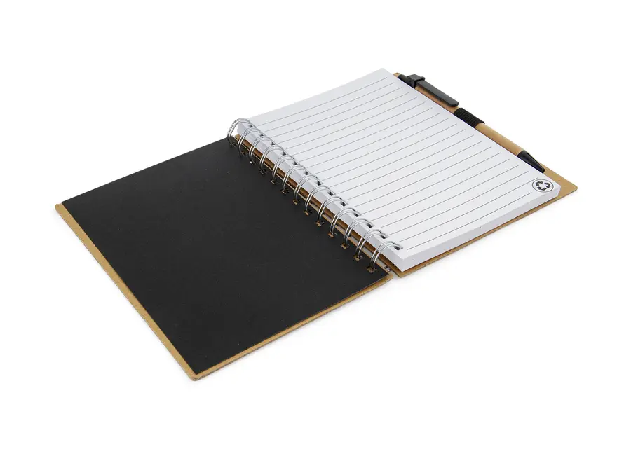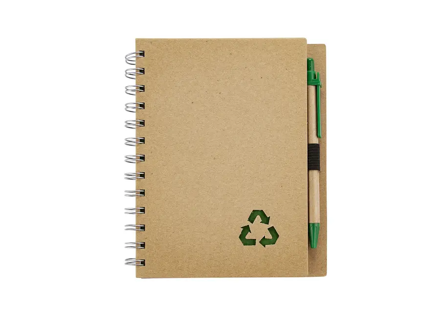 Libreta con tapa de cartón y argollado metálico doble «O con troquel en forma ecológico. Bolígrafo ecológico incluido de color similar. Con porta bolígrafo. Tamaño aproximado: A5. 80 hojas rayadas.