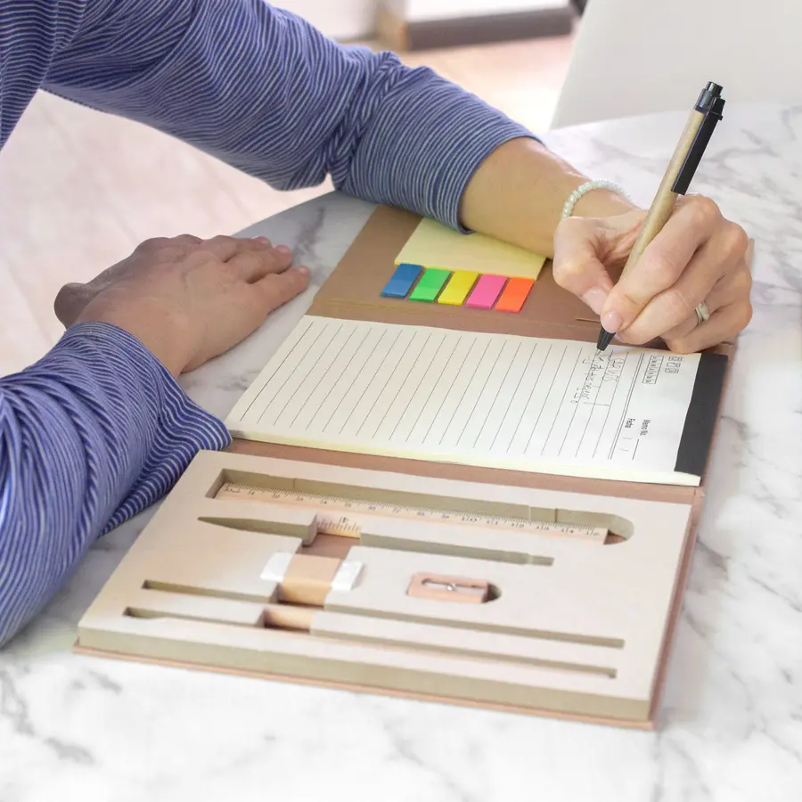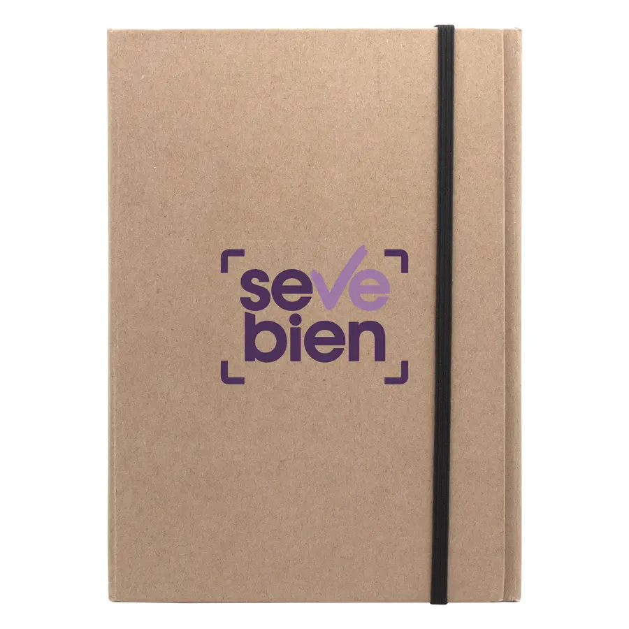 15 x 21 x 2.4 cm. (cerrado) y 48 x 21 cm. (abierto). Cartón kraft de gran firmeza. Cuaderno anotador múltiples funciones. El kit contiene: un bloc de hojas rayadas con fecha y dia de la semana, regla de madera, regla de pvc, dos lápices negros, goma de borrar, sacapuntas y bolígrafo tinta negra. Ademas un set de Post- it cuadrados amarillos y tiras plásticas autoadhesivas de diferentes colores (azul, verde, amarillo, rosa y naranja). El cierre del cuaderno es con una banda elástica de color negro que permite una buena sujeción.