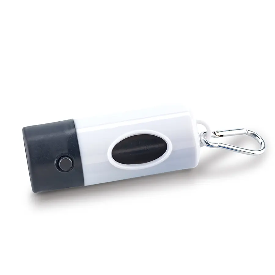 Dispensador de bolsas para mascota con linterna de un LED integrada. Incluye 15 bolsas. Pilas Botón Incluidas.