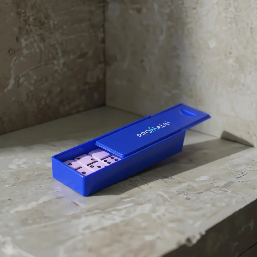Juego de dominó importado en estuche de plástico de producción nacional con tapa corrediza.