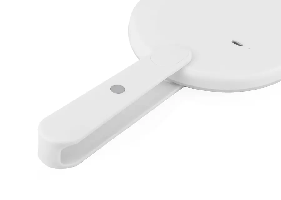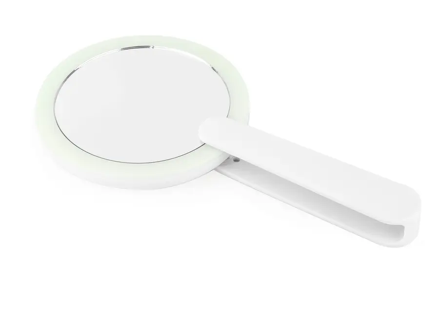 Espejo de maquillaje plegable con luz LED integrada. Cuenta con una sola luz que se activa al mover el agarre hacia un lado y se apaga automáticamente al plegar el espejo. Su diseño compacto lo hace ideal para llevar en el bolso o usar en espacios reducidos, ofreciendo iluminación práctica para retoques precisos.