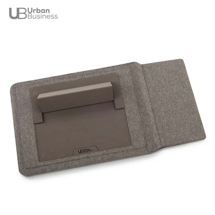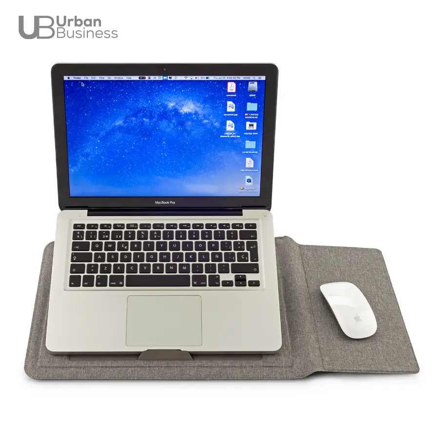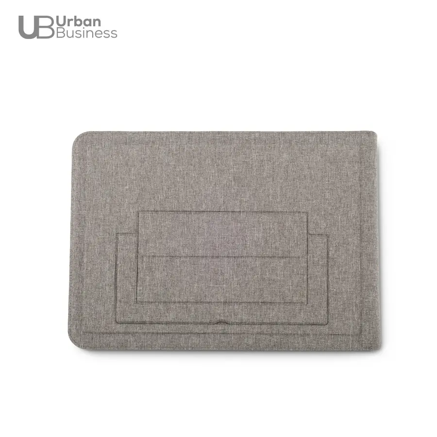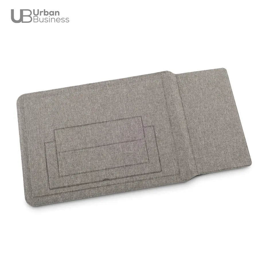 Soporte multiusos para trabajo en poliéster reciclado RPET. Tiene un soporte plegable el cuál se ajusta máximo a computadores de 16, la solapa funciona cómo mouse pad y tiene un compartimiento para documentos. Empaque caja individual.