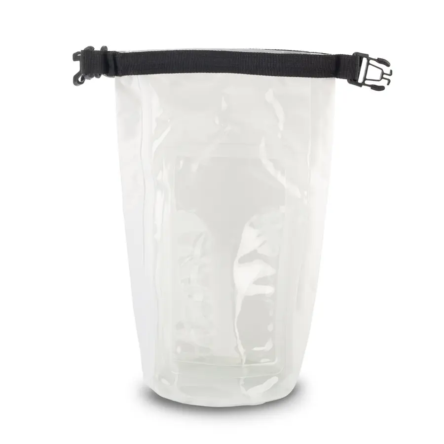 Bolsa seca en PVC con ventana plástica y bolsillo para celular. Capacidad 2.5 L.Con gancho carabinero.