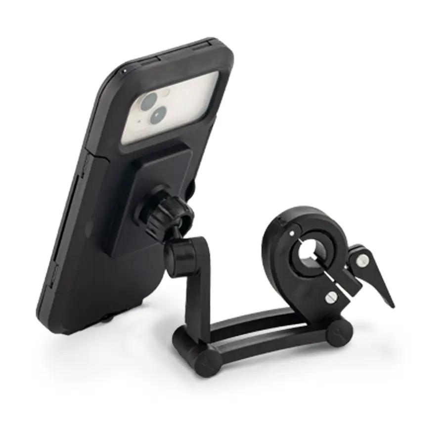 Soporte / Estuche plástico impermeable para celulares, se puede utilizar en moto o bicicleta. Barra ajustable y soporte universal. Empaque caja individual.
