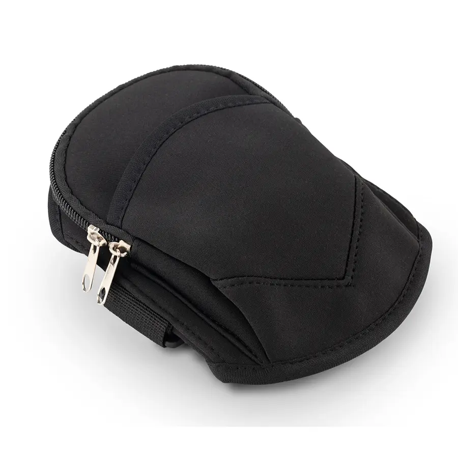 Funda portacelular en Neopreno para uso en el brazo. Un bolsillo externo sin cremallera y un bolsillo con cremallera.