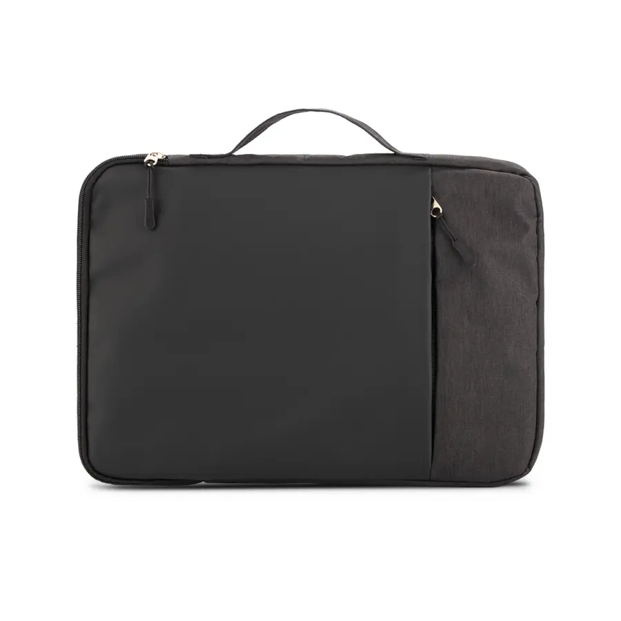 Funda alcolchada para portátil de hasta 15″, elaborada en poliéster reciclado RPET y poliuretano. Dos bolsillos externos con cremallera.