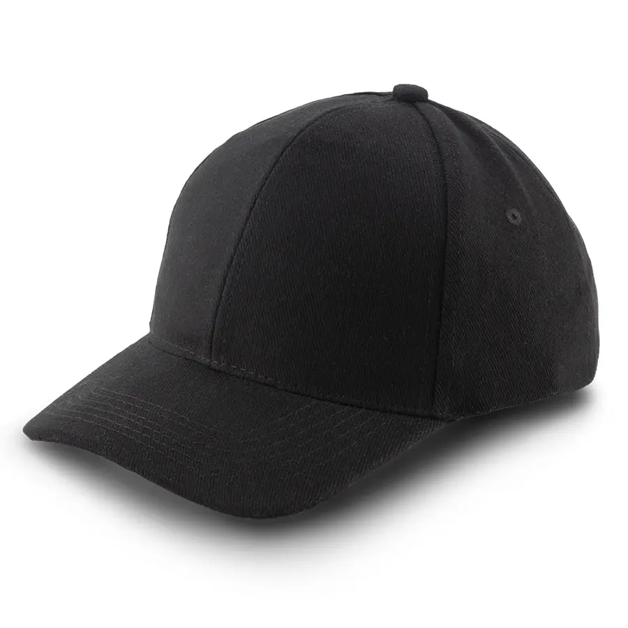 6 paneles, dril esmerilado, 4 ojetes bordados, visera indeformable 6 costuras, botón forrado, frente fusionado, encintado interior, tafilete absorbente en poliéster algodón, cierre hebilla metálica.