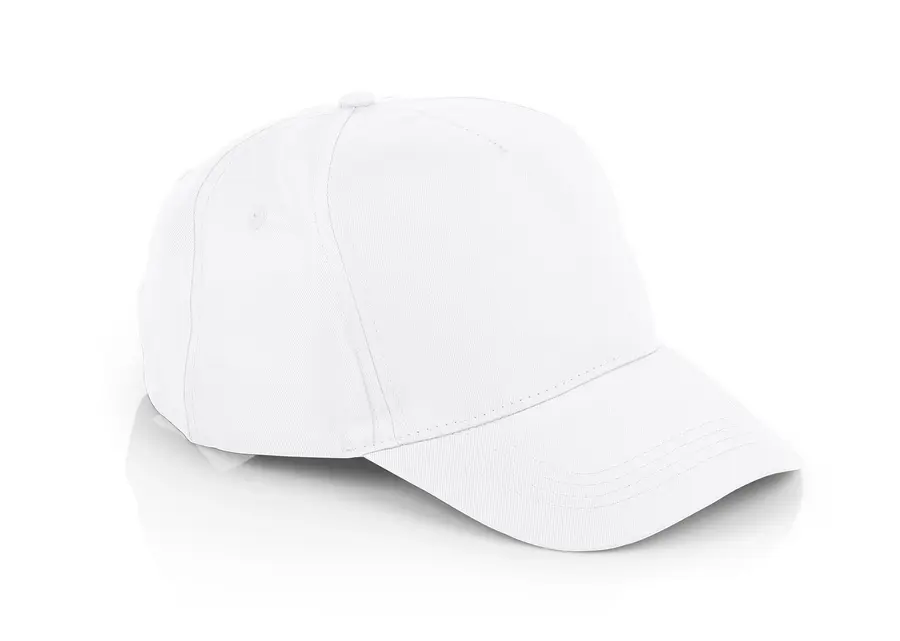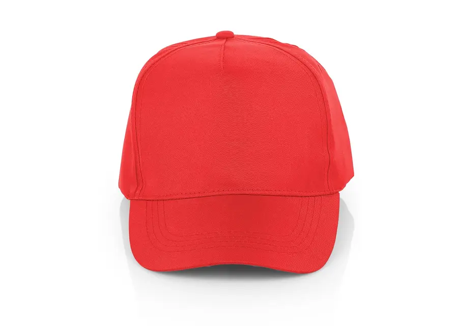 Gorra de 5 paneles con frente fusionado, visera indeformable 4 costuras, botón forrado, 4 ojetes bordados, tafilete textil y cierre velcro.