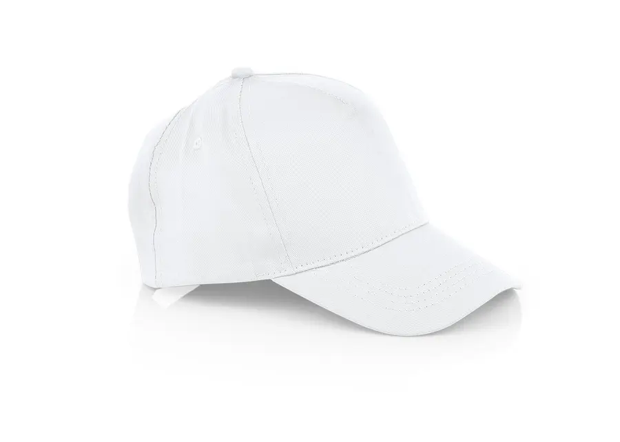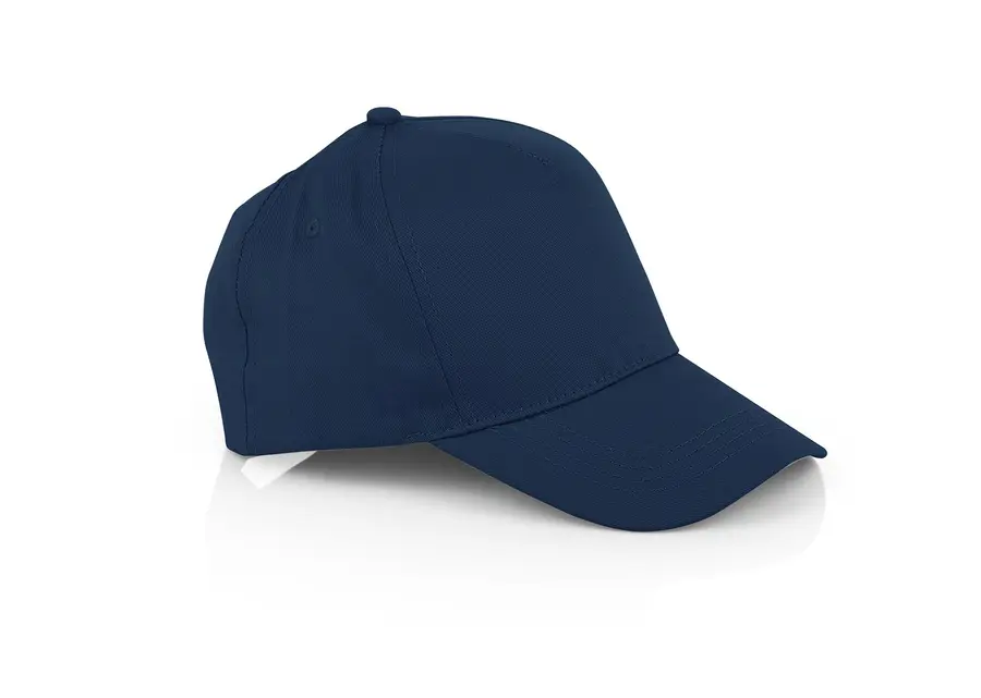 Gorra de 5 paneles con frente fusionado, visera indeformable 4 costuras, botón forrado, 4 ojetes bordados, tafilete textil y cierre plástico.