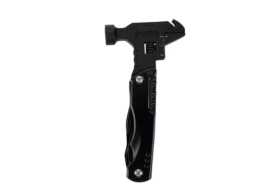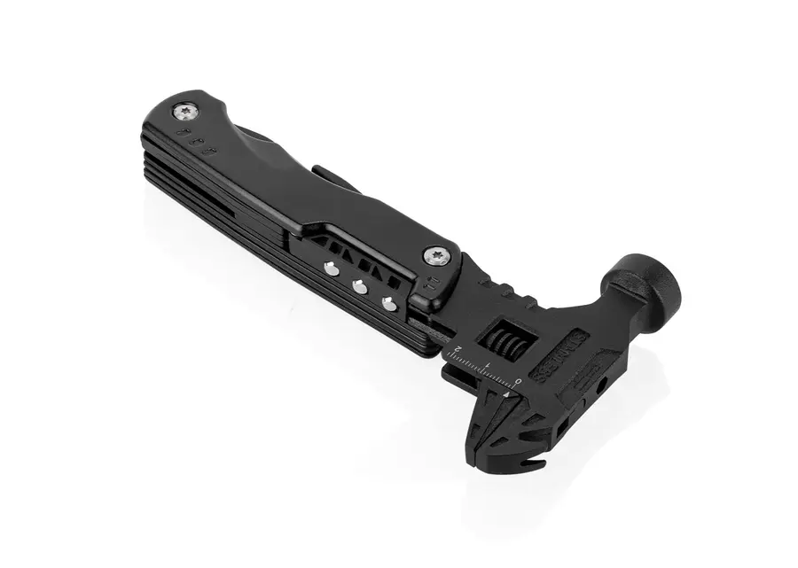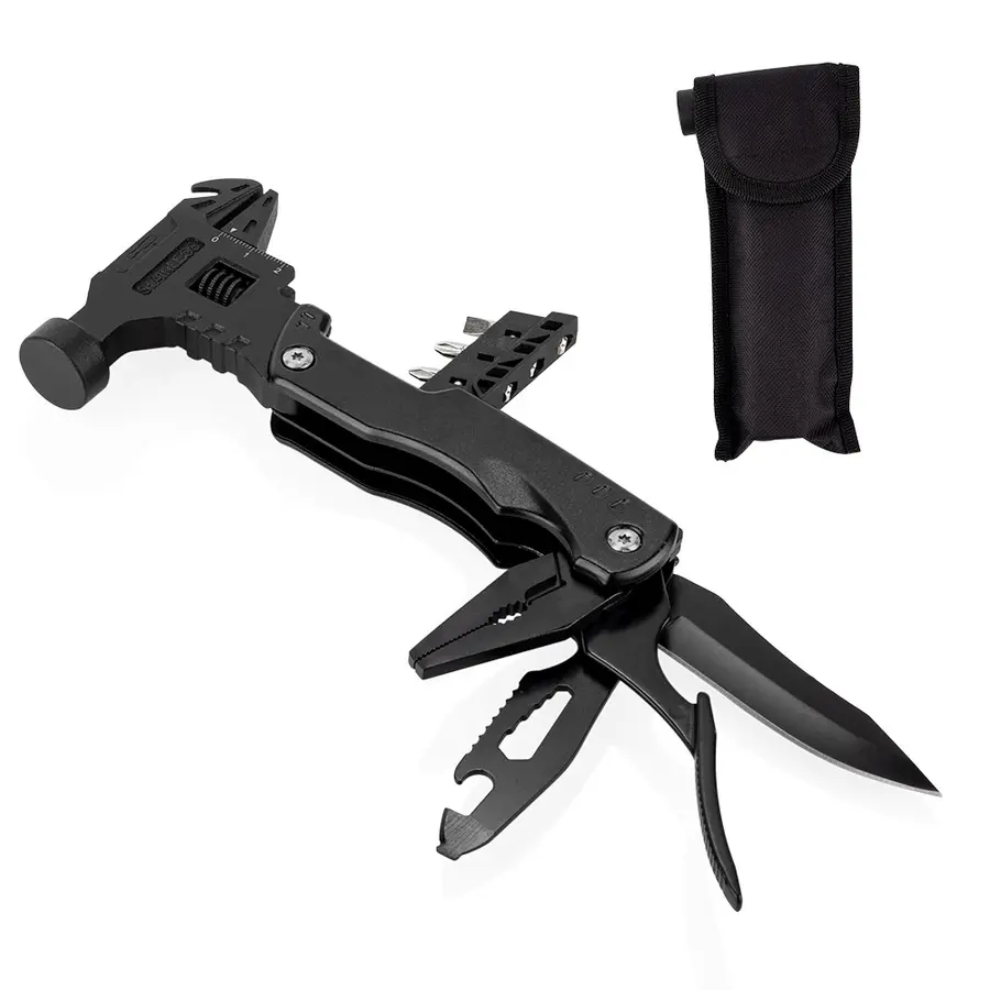 Esta herramienta multifunción integra en un solo cuerpo (8,5 X 26 X 2,4) compacto (8,5 X 16,9 X 2,4) una variedad de funciones esenciales: martillo y llave inglesa (8,5 X 17,8), extractor de clavos, tres tipos de destornilladores (estrella, plana y prozidriv), cuchillo (2 X 18,8) y una herramienta adicional con destornillador de 3 mm, dos tipos de abrebotellas, sierra y cabeza hexagonal en cinco tamaños (2 X 18,8). También incluye una pinza con punta de aguja, pinza regular y cortador de alambre (2,2 X 17). Su diseño plegable permite un fácil almacenamiento y transporte, e incluye un estuche para mayor practicidad.