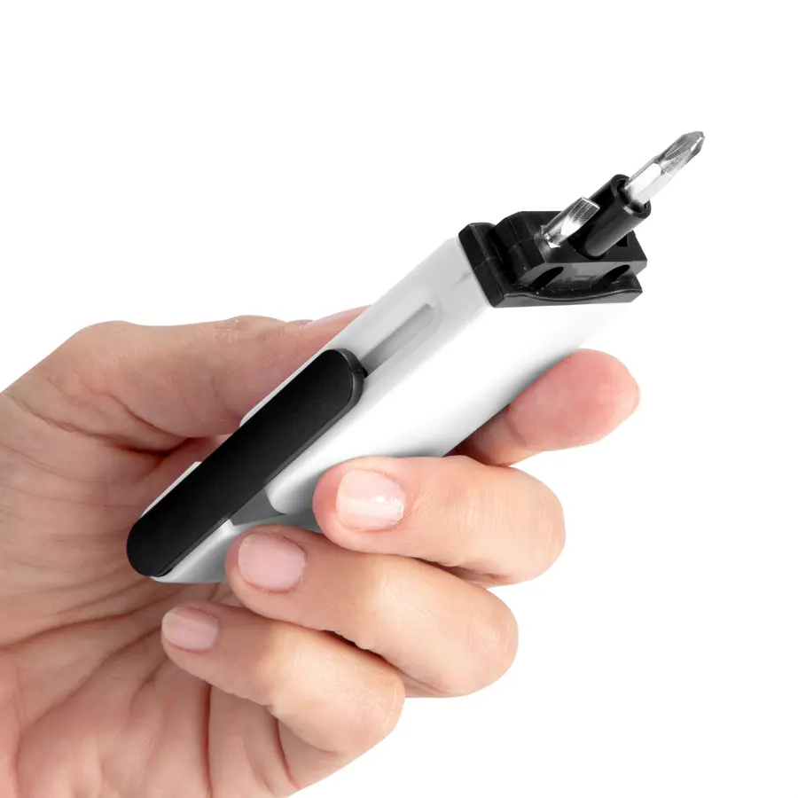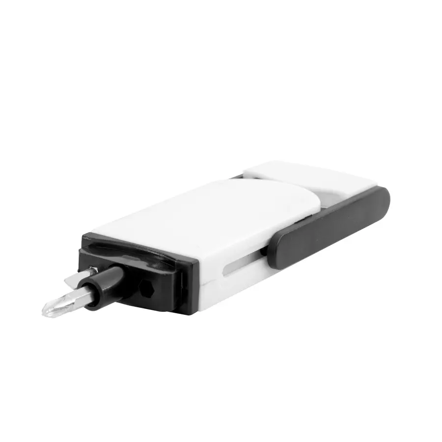 Todo en uno, siempre a mano.Set de destornillador con 2 puntas intercambiables ocultas (plana de 3,5 mm y phillips de 2mm.) Ambas en CR-V que las hace más durables y resistentes a la corrosión. Incluye cinta métrica de 1 m. con escalas en centímetros, pulgadas y pies. Cuerpo imantado para poder fijar las puntas. Apertura por deslizamiento.Medidas: 9 x 3,8 x 1,4 cm. Materiales: ABS, Acero y CR-V