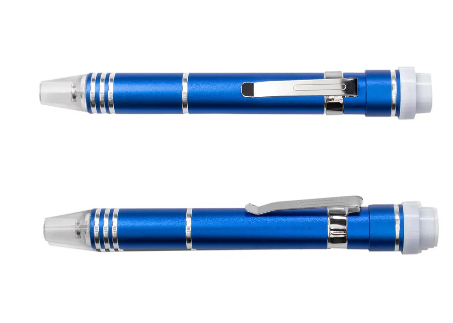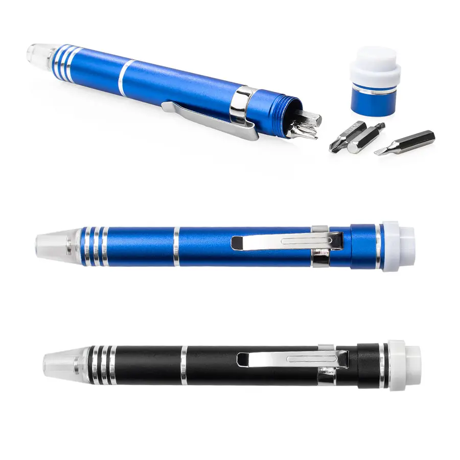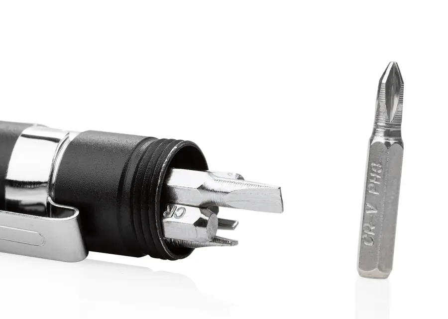 Práctico y versátil herramientero con clip, ideal para llevar siempre a mano. Cuenta con una tapa de presión que asegura el botón de encendido de la linterna integrada, brindando funcionalidad adicional en cualquier situación. En la parte superior incorpora un cierre giratorio que almacena 6 puntas de destornillador intercambiables, las cuales se insertan fácilmente en la punta del herramientero para realizar reparaciones rápidas y precisas. Su diseño compacto y metálico lo convierte en una herramienta indispensable para el día a día.