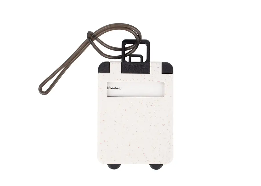 Etiqueta de equipaje ecológica fabricada en material de paja de trigo, con correa de PVC resistente para sujetarla fácilmente a maletas o mochilas. En su interior incluye una pegatina para datos personales como nombre, dirección, correo electrónico y teléfono, lo que facilita la identificación del equipaje en caso de pérdida.